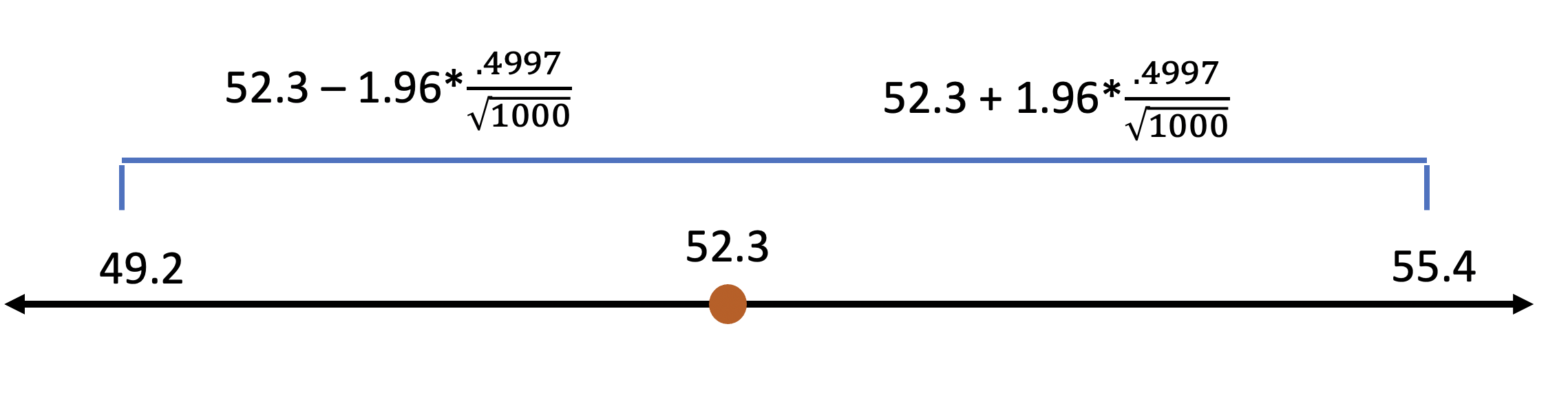 What that means for our example election is that we can be 95% confident that the true percentage of voters that will vote for Duke is somewhere between 2 standard errors above the sample mean, and 2 standard errors below the sample mean. Calculating those lets us say that the vote should fall somewhere between 49.2 and 55.4.