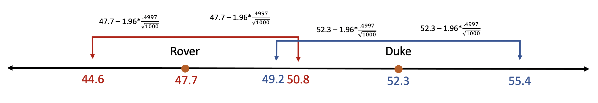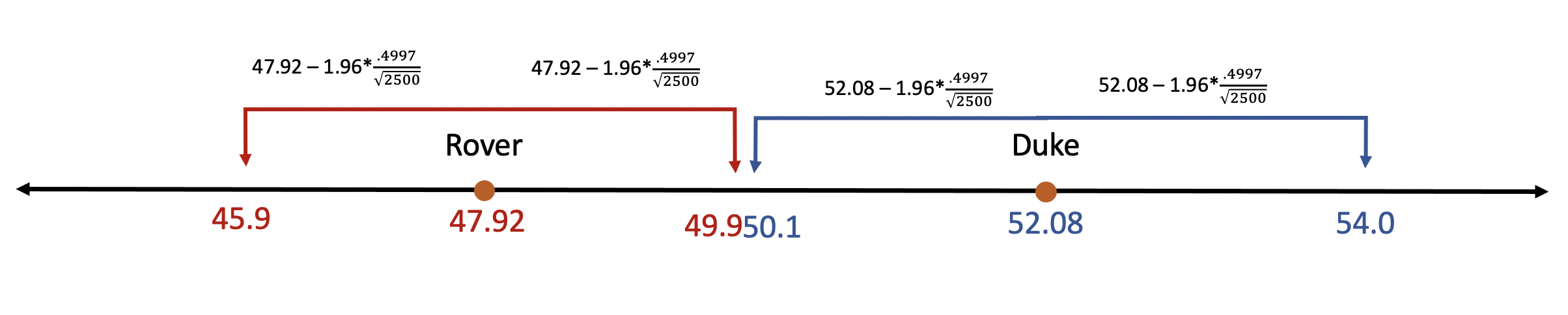 That is to say it is possible the population mean wildly differs from the sample mean, but we generally expect them to be similar, and depending on how close the race is we can start to figure out the chances of Duke or Rover winning.