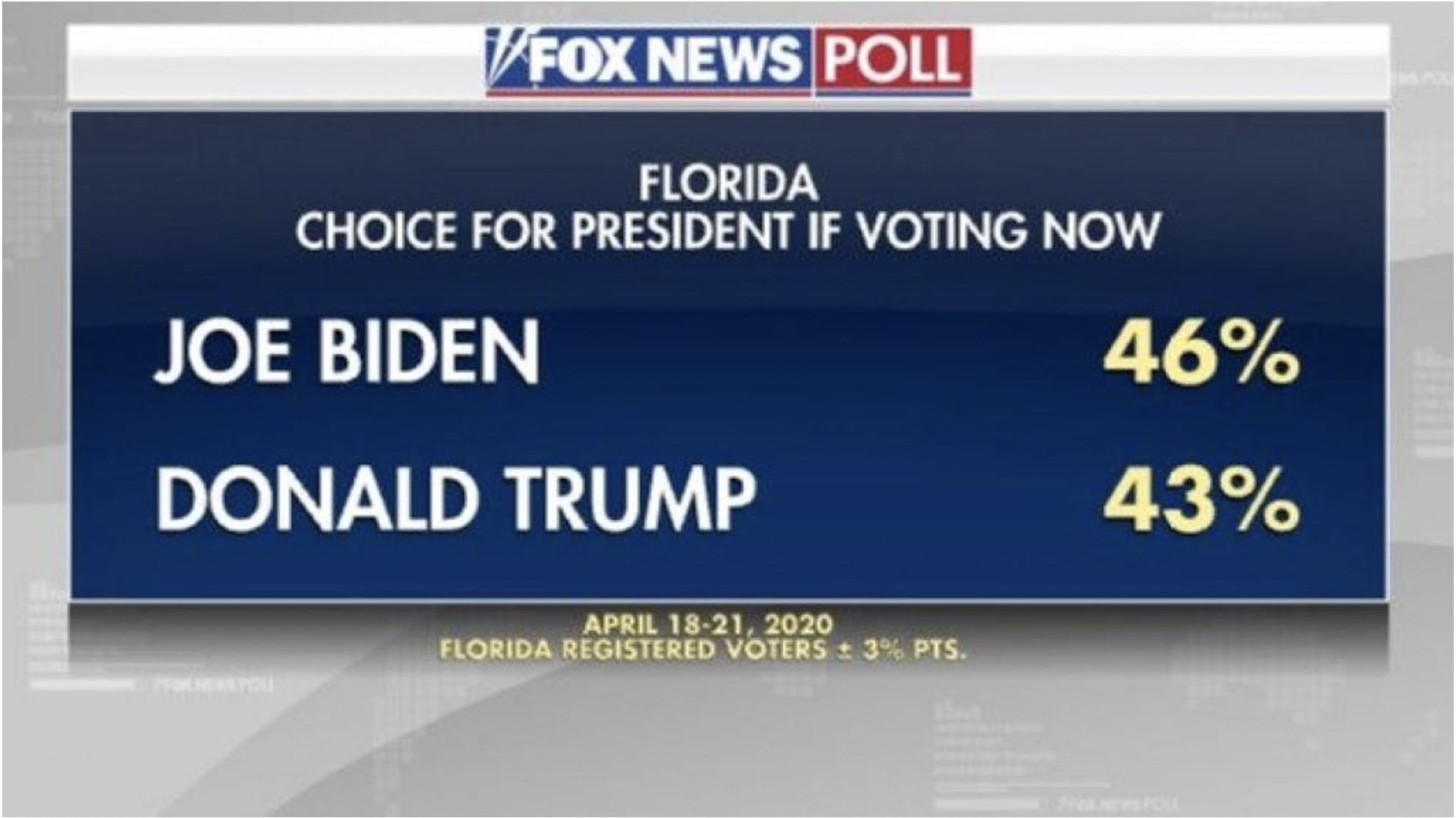 The big print goes to the headline takeaway: Biden leading in important swing state. But underneath that, in much smaller font, are some important details. The poll was conducted April 18-21. It was conduced for Florida Registered Voters (more on that later). And then there is the %+-% 3% points. That means the sample found 46% of registered voters in Florida planned to vote for Joe Biden, and 43% planned to vote for Donald Trump, with a margin of error of plus or minus 3 percentage points in the population.