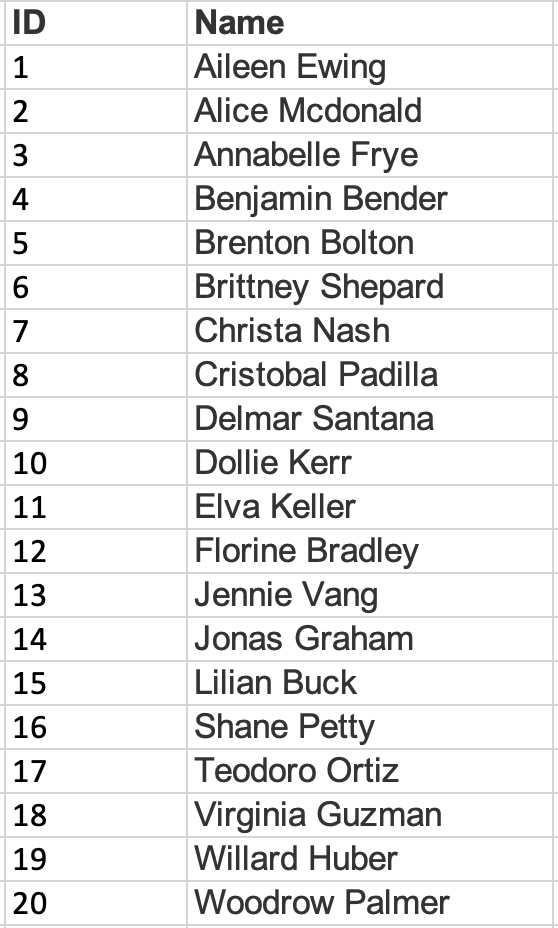 Let’s say you do have a sampling frame though. For instance, you might be hired to do a survey of members of the Republican Party in the state of Utah to understand their political priorities this year, and the organization could give you a list of their members because they’ve hired you to do the reserach. One method of constructing a simple random sample would be to assign each name on the list a number, and then produce a list of random numbers. Once you’ve matched the random numbers to the list, you’ve got your sample. See the example using the list of 20 names below