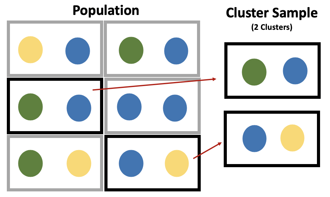 The image below shows how this can work, although the example is oversimplified. Say we have 12 students that are in 6 classrooms. The school is in total 1/4th green (3/12), 1/4th yellow (3/12), and half blue (6/12). By selecting the right clusters from within the school our sample can be representative of the entire school, assuming these colors are the only significant difference between the students. In the real world, you’d want to match the clusters and population based on race, gender, age, income, etc. And I should point out that this is an overly simplified example. What if 5/12s of the school was yellow and 1/12th was green, how would I get the right proportions? I couldn’t, but you’d do the best you could. You still wouldn’t want 4 yellows in the sample, you’d just try to approximiate the population characteristics as best you can.