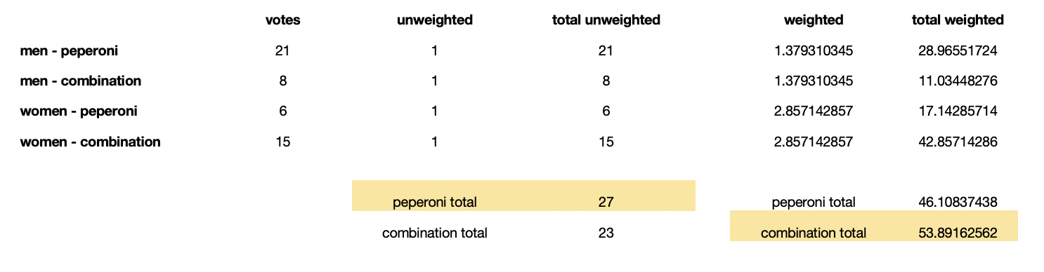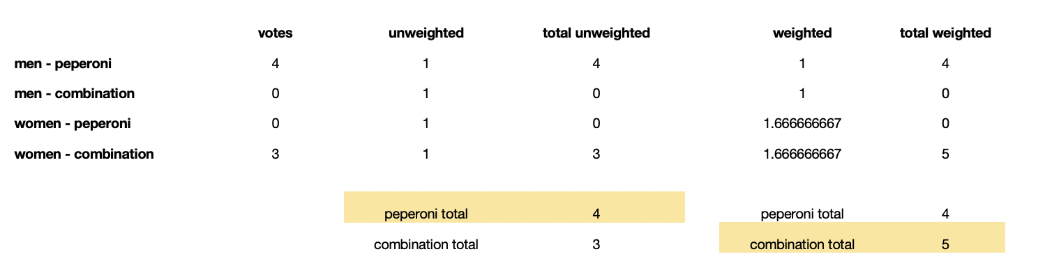 Imagine you’re setting up a pizza party for your class. There are 9 people in your class, 4 men and 5 women. You only got 4 responses from the men, and 3 from the women. All 4 men wanted peperoni pizza, while the 3 women want a combination. Pepperoni wins right, 4 to 3? Not if you assume that the people that didn’t respond are the same as the ones that did. If you weight the responses to match the population (the full class of 9), a combination pizza is the winner.