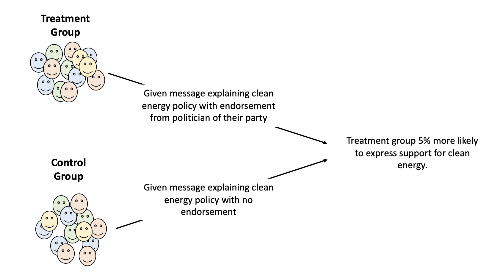 The advantage of using an experiment is control. As the researcher you get to create the setting and the conditions for an experiment. With an experiment you’re not just seeing what people think (“what percentage of people support clean energy policies?”) but testing the impact of a treatment that you’ve identified (“does seeing that a politician of the same party supports clean energy make voters more likely to voice support”).