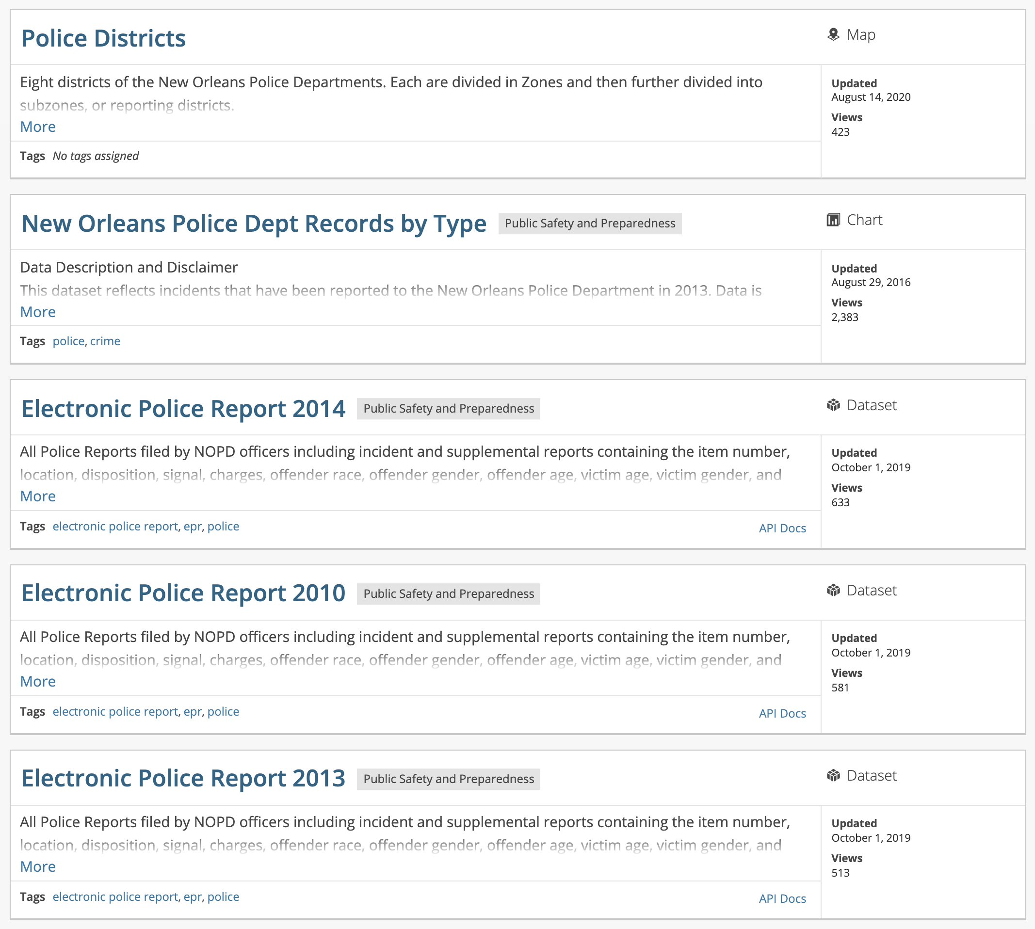 Most large cities now have a website where they publish publicly available versions of their data. You can connect this data to census data to understand how services match with community demographics, and answer other questions about how your city is being managed. Take a look at a partial list of the data that’s available related to police and crime for the City of New Orleans below. Again, a very partial list, and I’d encourage you to go search for your city’s data depository to see what is available.