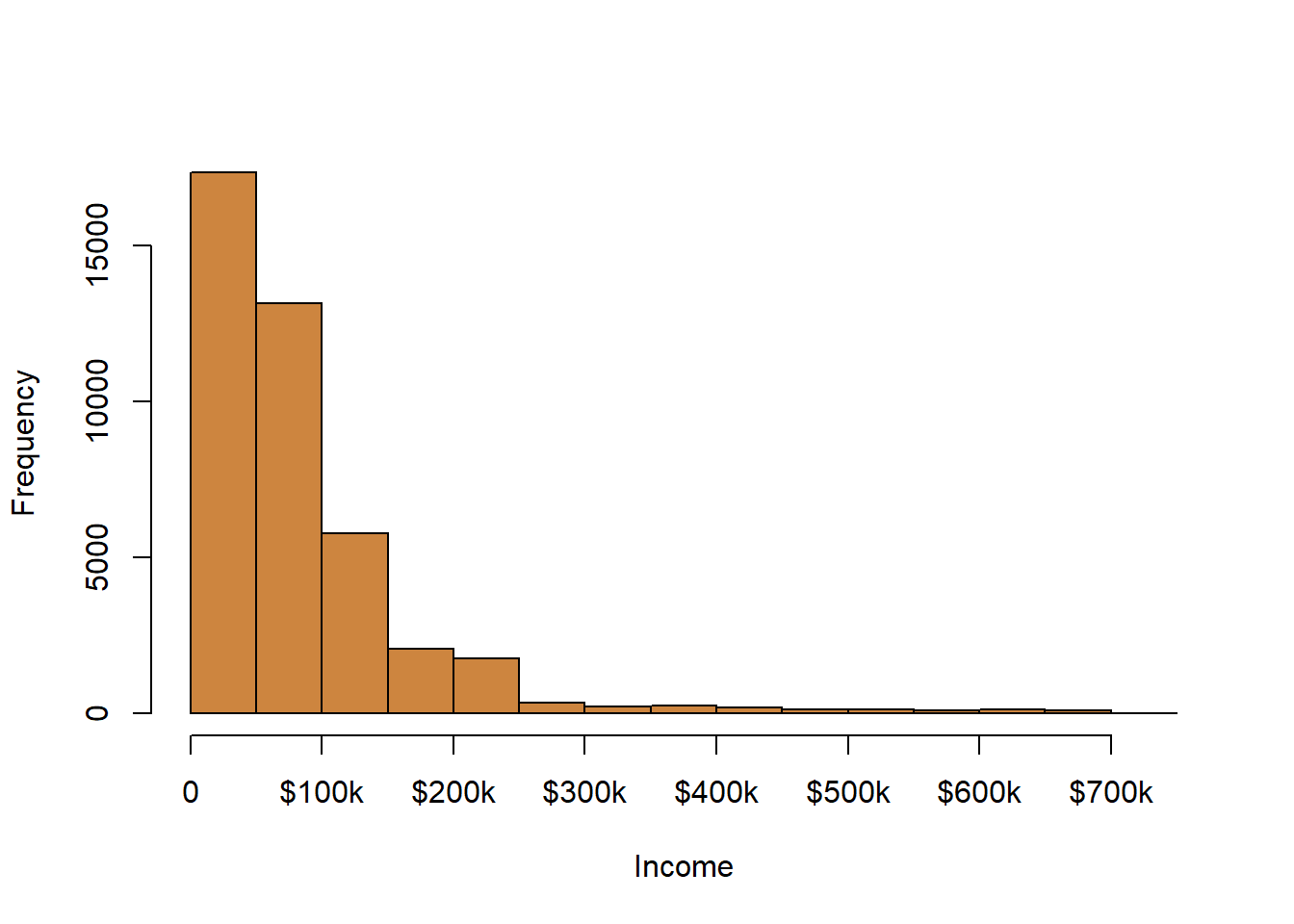 Here the data is broken up into intervals of $50 thousand dollars. As shown, the vast majority of respondents earned less than $100 thousand, with very few responses for those above $250 thousand. Overall we’d say this data is skewed with a right tail. That’s all it’s saying, but that’s also important to say because that might affect how we use this data later (but that’s getting ahead of ourselves somewhat).