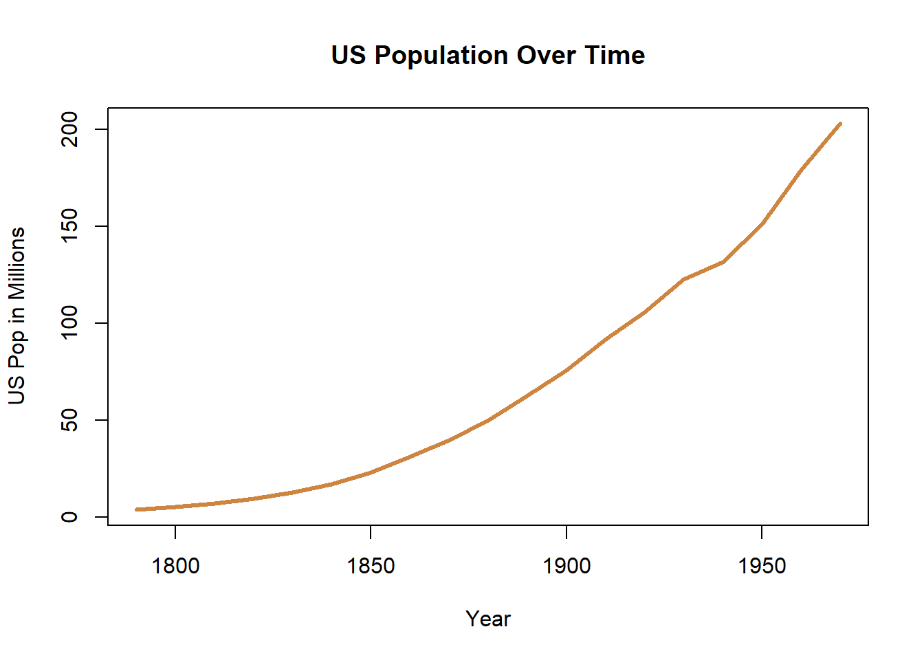 What might we want to graph using a line chart? First and foremost, something that has changed over time. For instance, let’s see how the population of the United States has changed between 1790 and 1970.