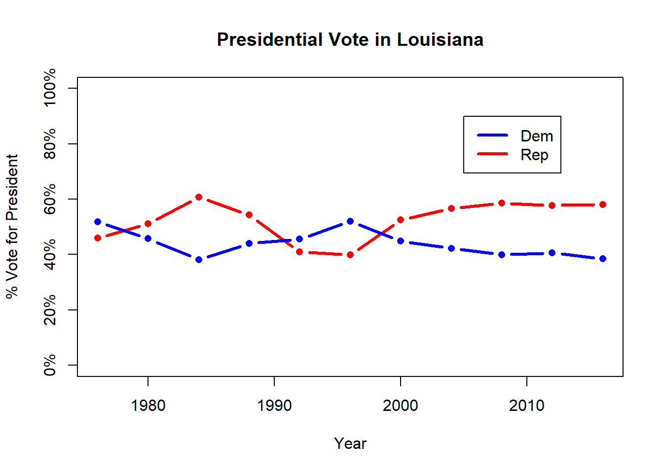 What’s the story? Republicans typically win Louisiana, and the relationship has become very stable the last few elections. If you do add a second line to a line graph, it’s important to add a legend to identify which line is which. We’ve used the traditional colors of the Republican and Democratic party so it might be clear with a legend in this case, but if you handed this to an alien from Mars they wouldn’t know that.
