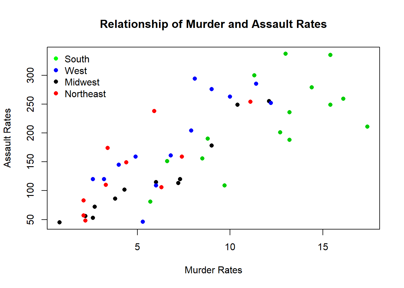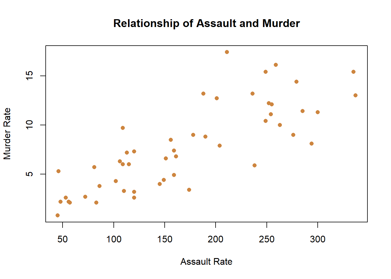 When you want to graph two continuous variables from your data and neither is time a scatter plot is the most likely way forward. Scatter plots are an excellent way to see if there is a relationship between the variable on the x-axis and the y-axis. We used a line chart to see if the variable we were graphing changed over time. With a scatter plot we want to see whether differences in the value of the x-axis is associated with changes in the y-axis. For instance, let’s graph some data for crime rates in US states, and see if there is a relationship between the murder rate in a state and the assault rate.