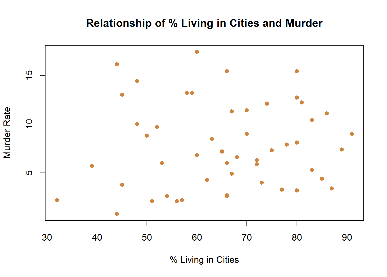 Two variables don’t need to have a clear relationship to be graphed using a scatter plot. For instance, let’s graph the percentage of people in each state that live in cities and the murder rate, and see if there’s a relationship.