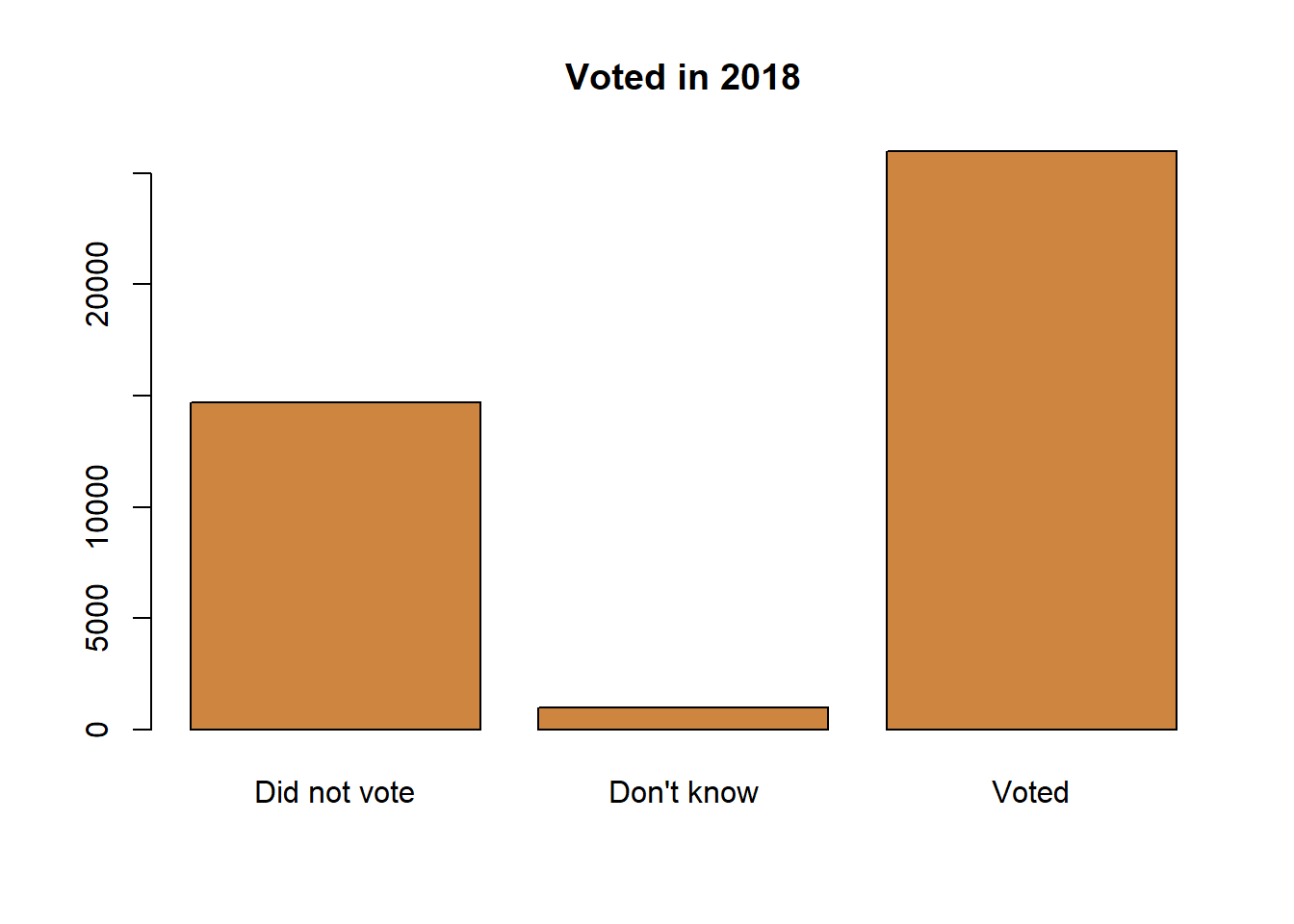 In the data on voters that we’ve used a few times there’s a column indicating whether the survey respondent had voted or not in the November 2018 election. Let’s see how many of the respondents voted.