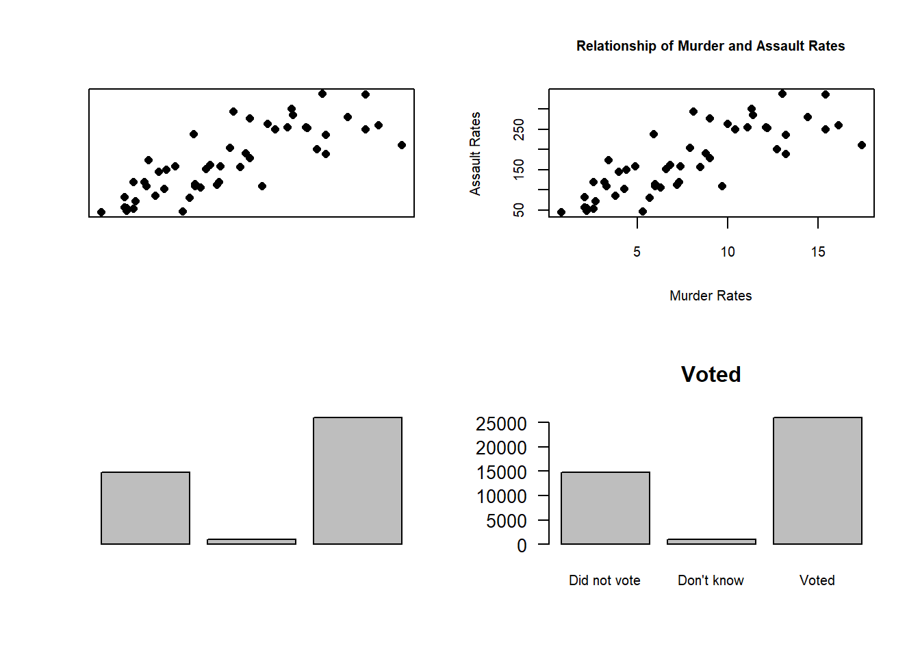 We’ll use 3 different commands to create the 4 plots described above. We’ll both create a very very basic plot for each, before showing all of the options we can customize to create an attractive and professional graph. The default options are sufficient if analyzing the data for yourself, but you’ll want to put some gloss on the graphs before using them as part of a project.