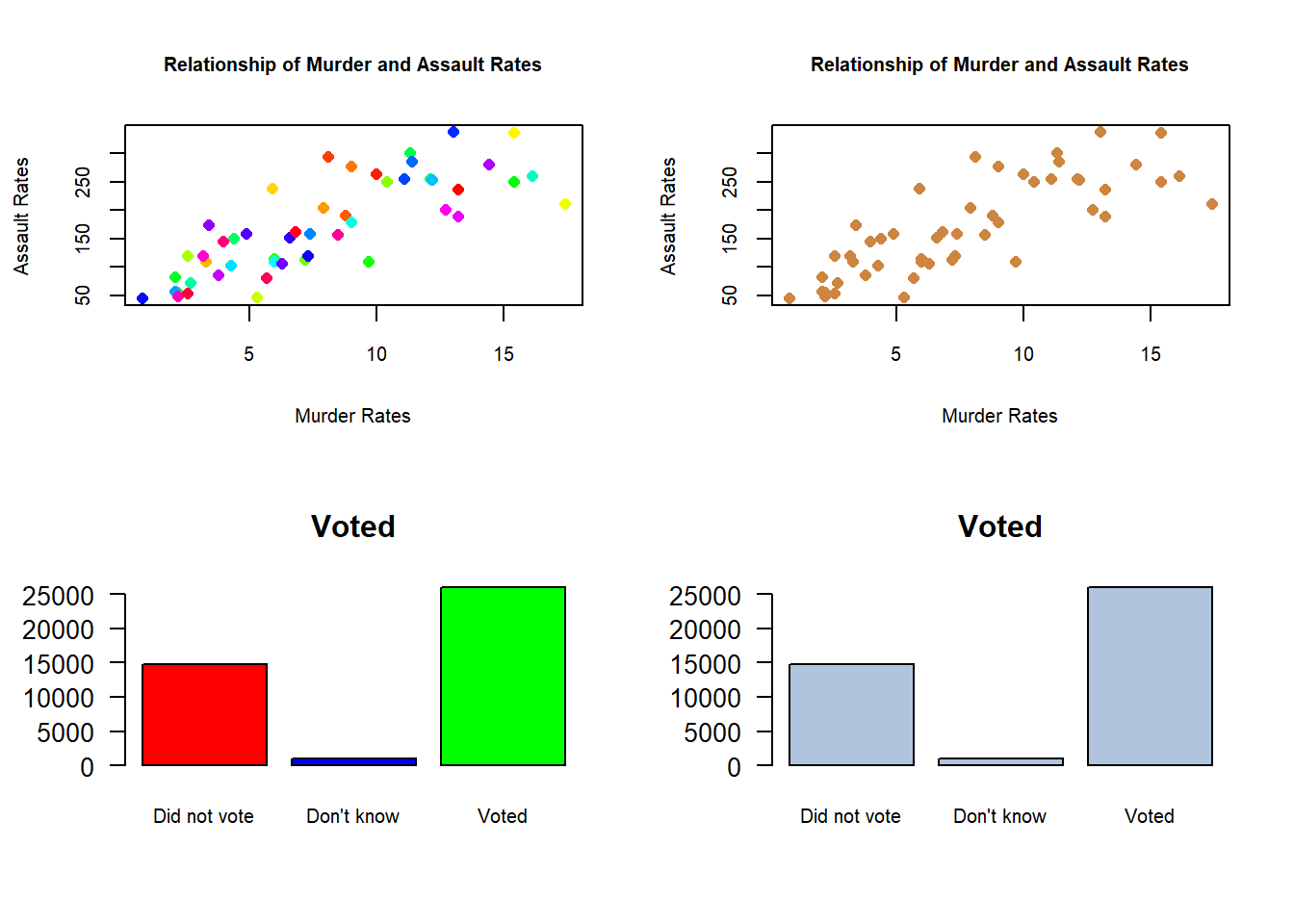 One of the great things about creating a graph in R is the number of options you can customize to make your graph look exactly the way that you want. But before we talk about the options, we should first get the basic graph down. You should generally start with a basic or plane graph to see how the default options make the data look, before beginning to add your customizations. In particular, different options may be more or less applicable depending on the type of graph you choose.