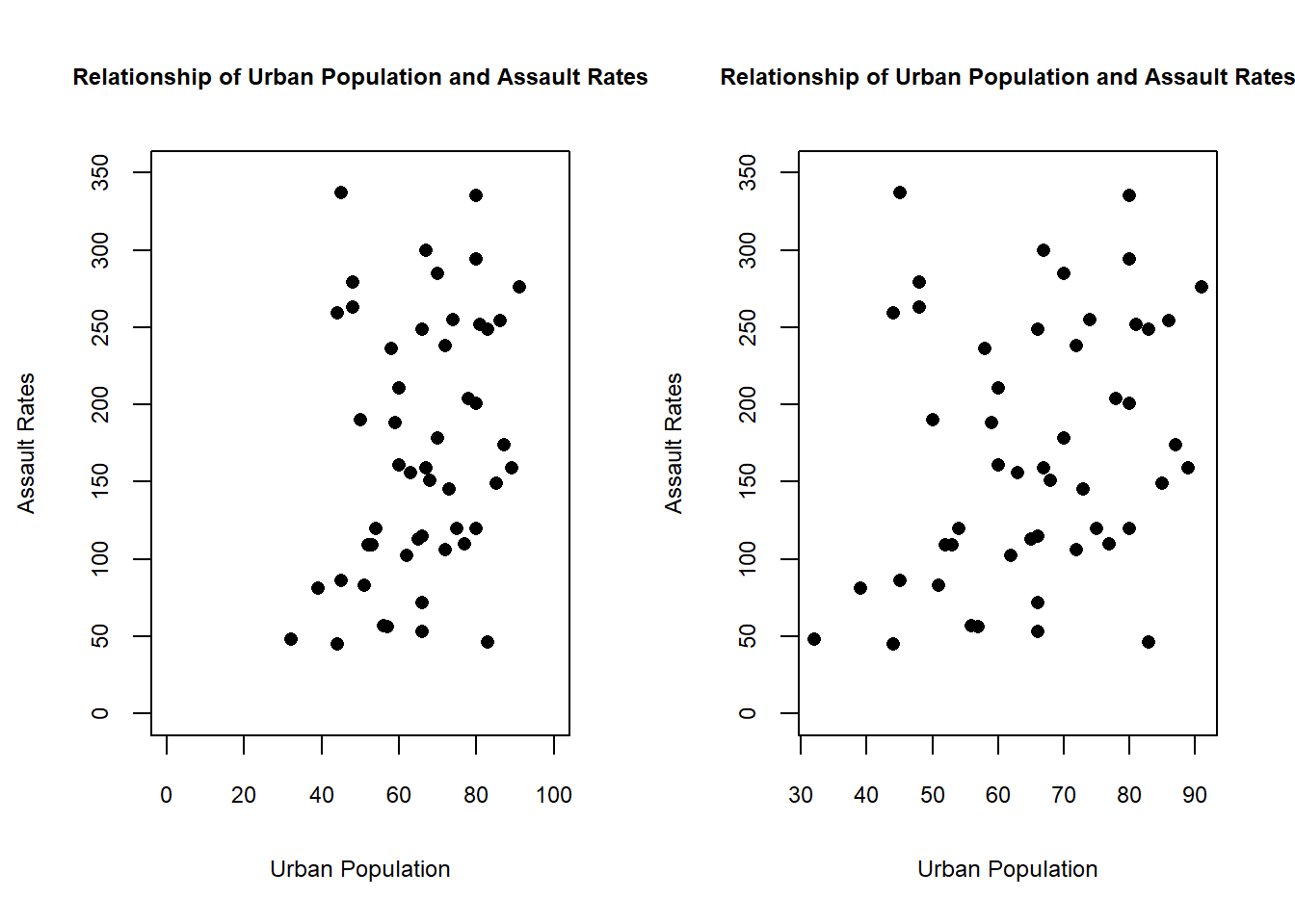 What’s the story here? The story is that there is no relationship between the two variables. Knowing that a state is higher on one doesn’t help you know if it’s higher on the other. The graph shows the lack of a relationship fairly clearly. That isn’t necessarily bad, but if I was trying to write a paper about how the percentage of people living in cities was predictive of the murder rates at the state level I would be worried. It’s pretty clear from that one graph that my paper isn’t going to return an interesting finding, since there clearly is no relationship.