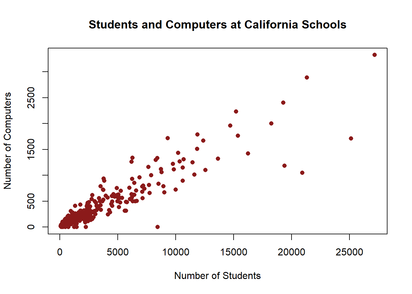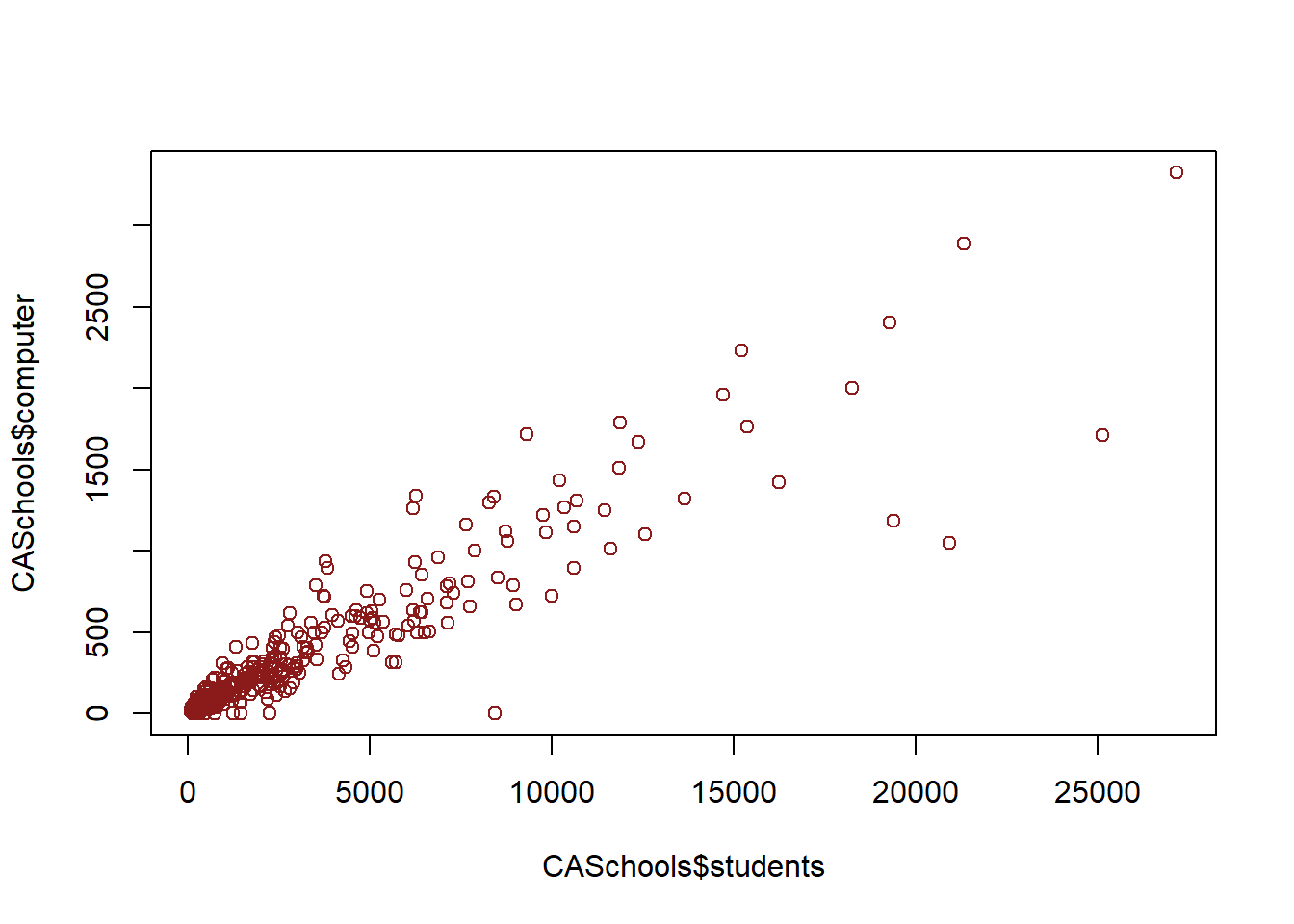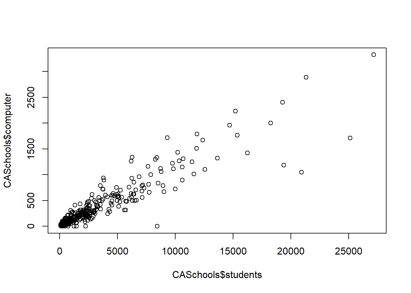 To create a basic scatter plot you’ll use the command plot() and provide it a variable to go on the x-axis and a variable to go on the y-axis. Let’s create a scatter plot using the data on California schools we used in the last chapter, and look at the number of students on the x-axis and the number of computers on the y-axis