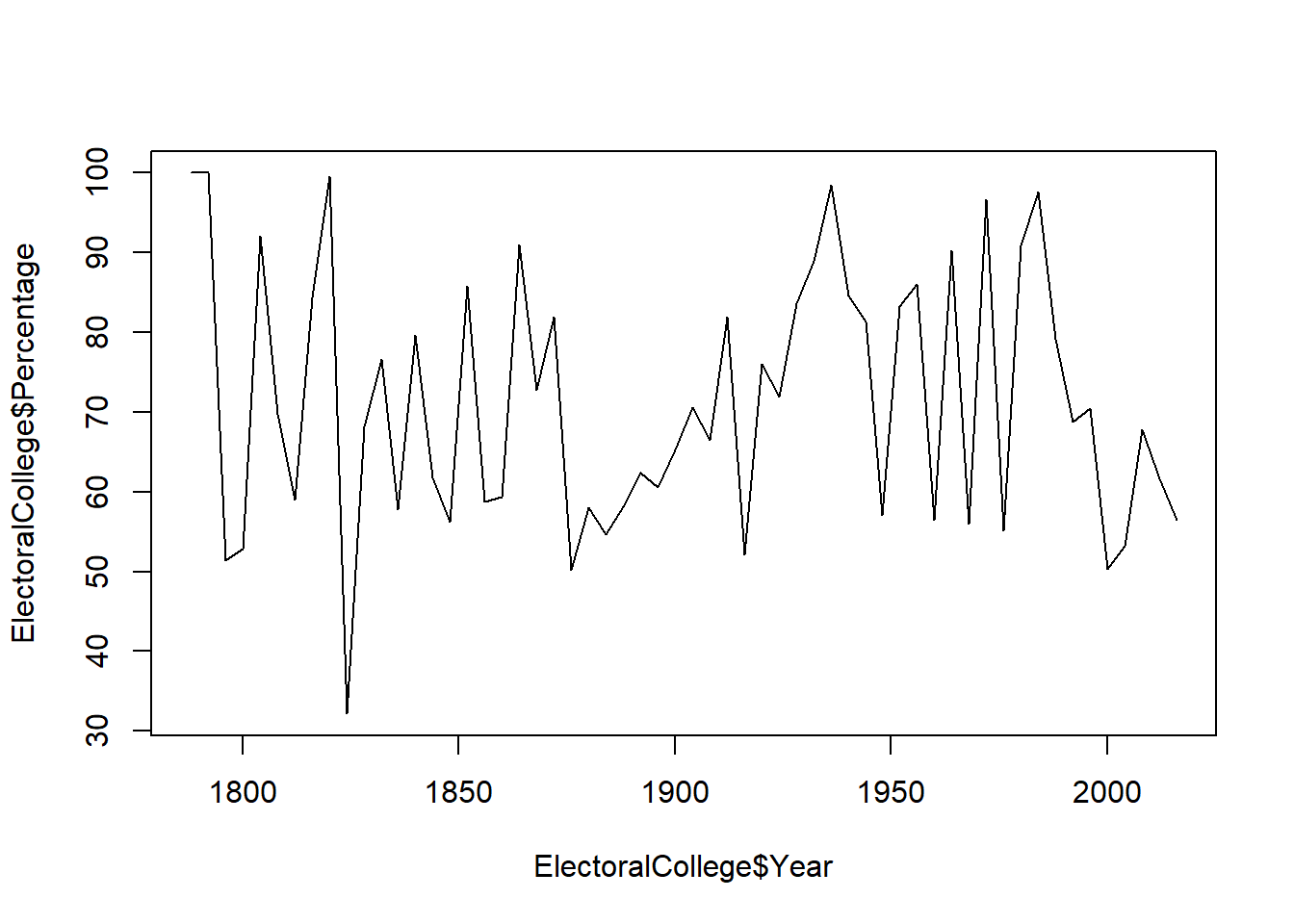 ElectoralCollege <- read.csv("https://raw.githubusercontent.com/ejvanholm/DataProjects/master/ElectoralCollege.csv") ## Loading in the data
