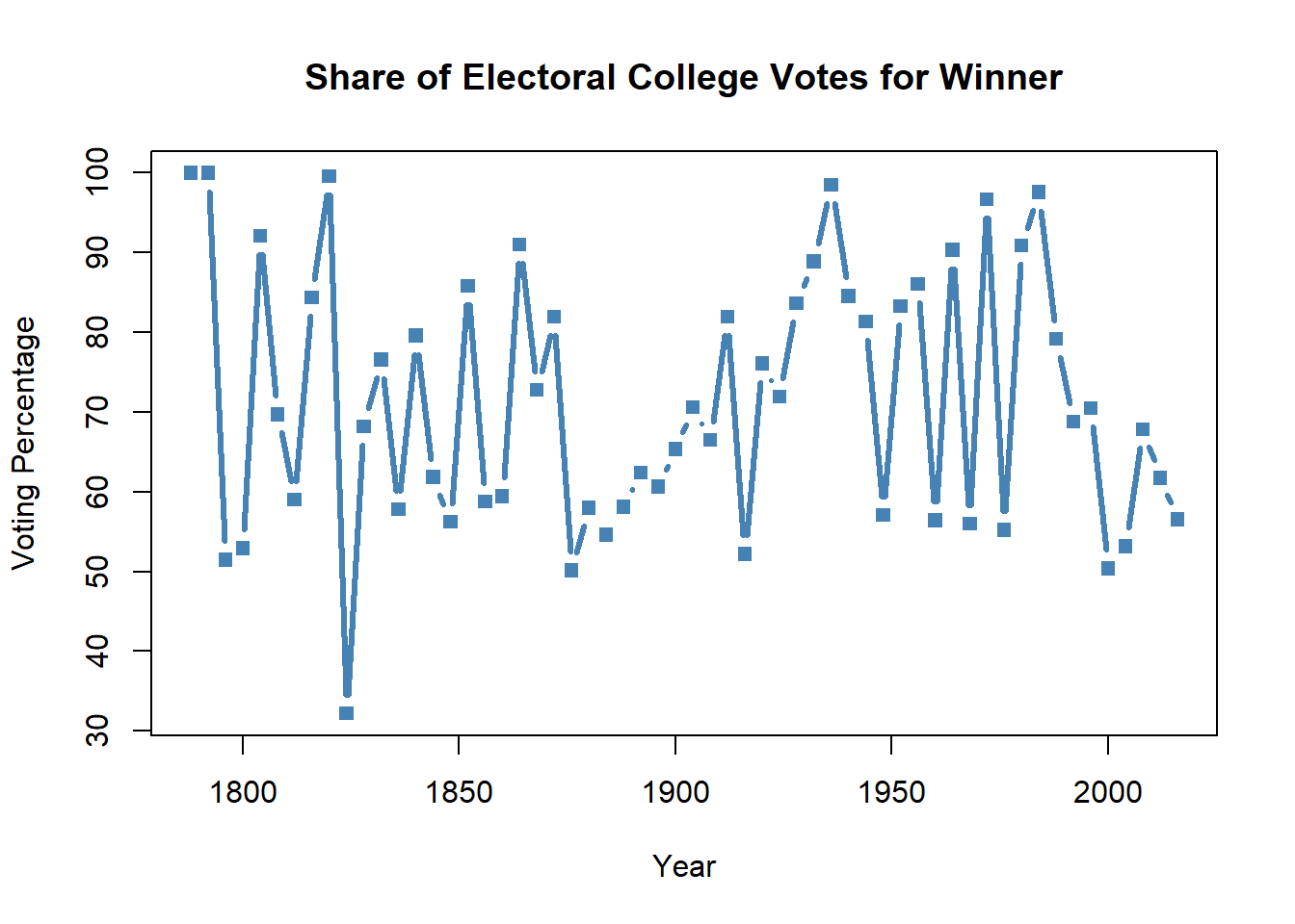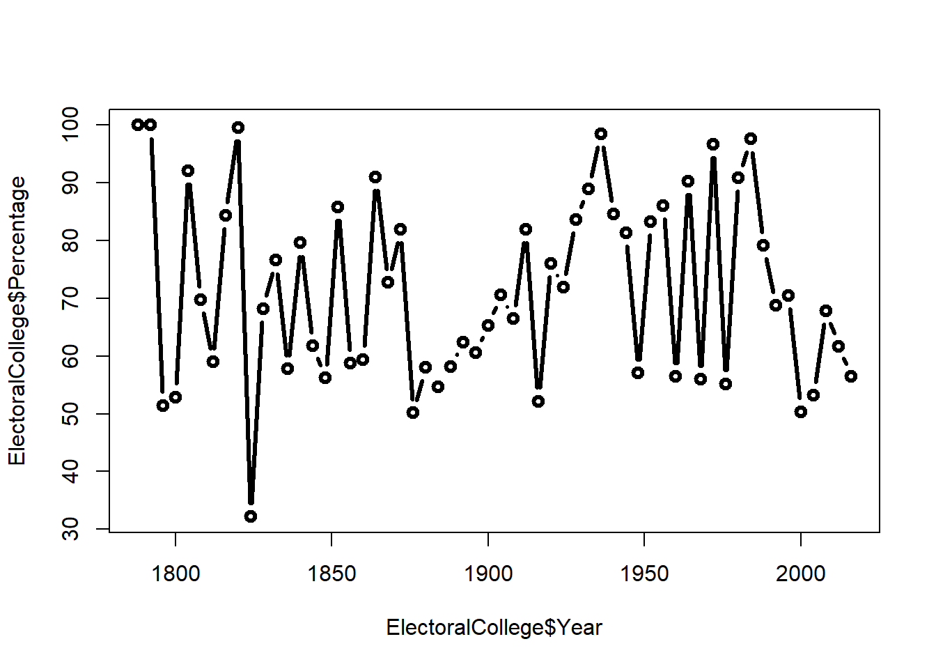 Let’s graph the percentage vote in the electoral college for the winning candidate. We’ll start with a basis plot with no options to see how that looks. We’ll put the variable Year on the x axis and Percentage on the y axis.