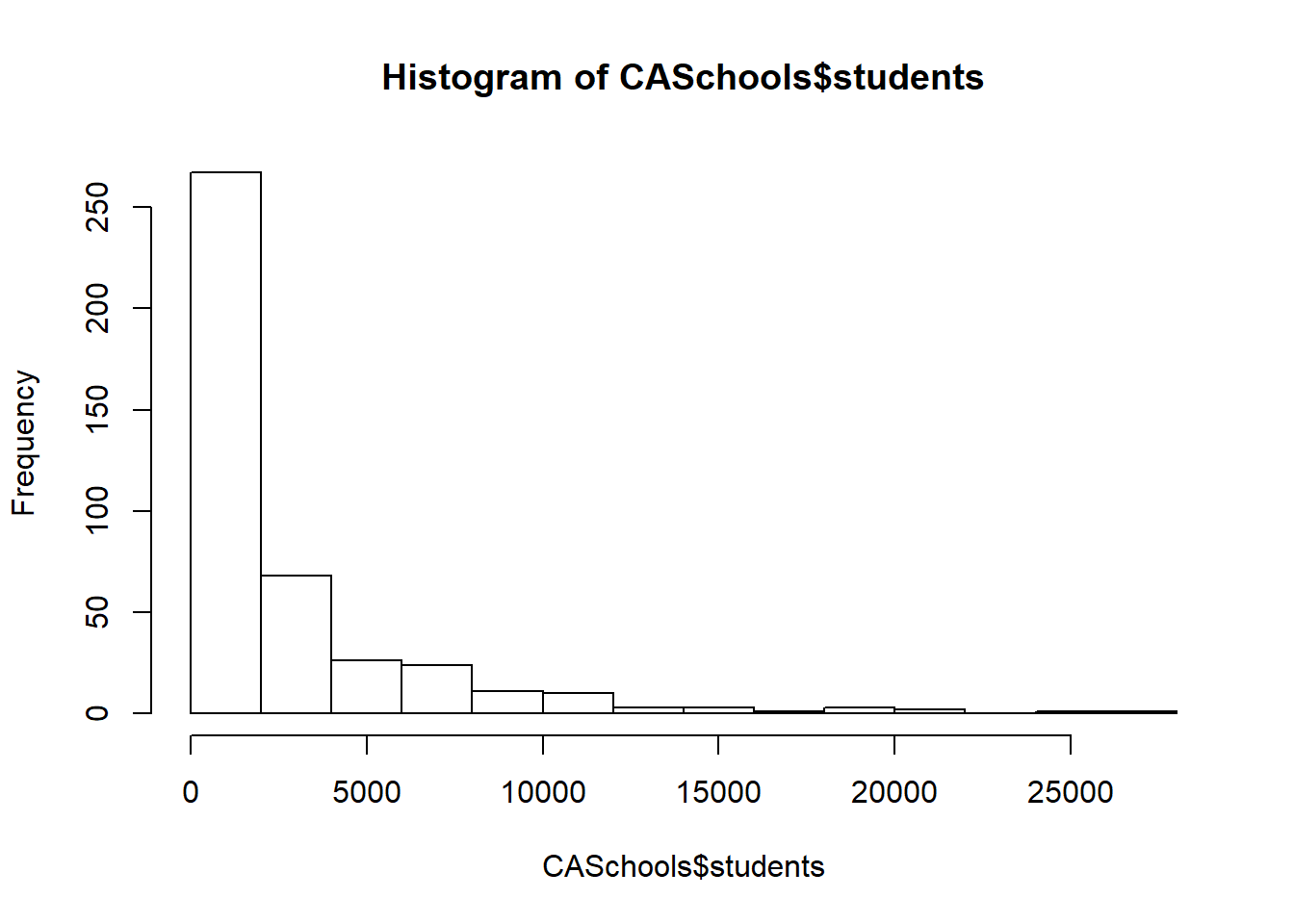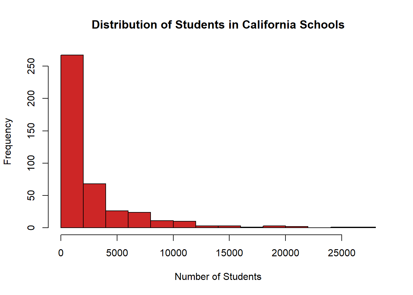 Next let’s create a histogram that shows the number of students at each school in California . This is a good moment to think or look back to remember what a histogram is used to show. The answer is the distribution of one continuous variable. For this example, let’s look at the distribution of the number of students across schools in California.