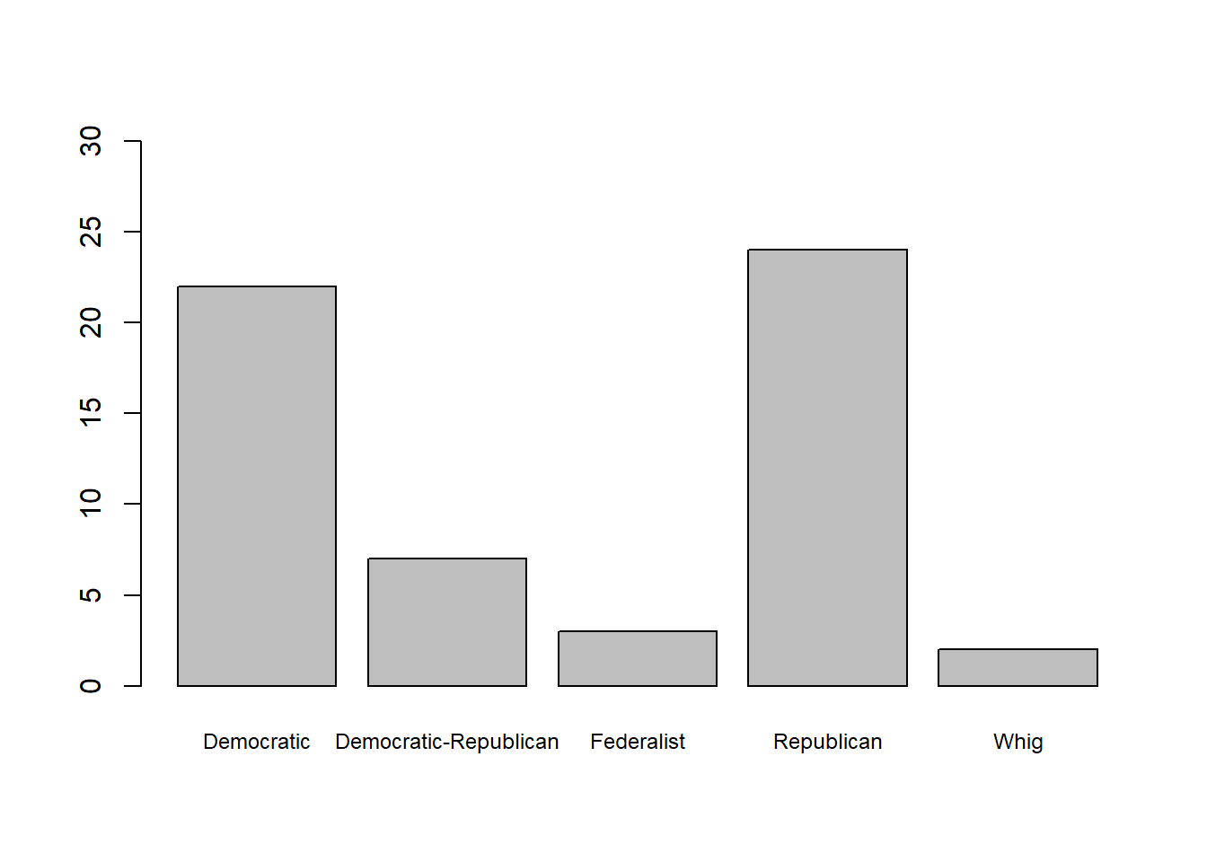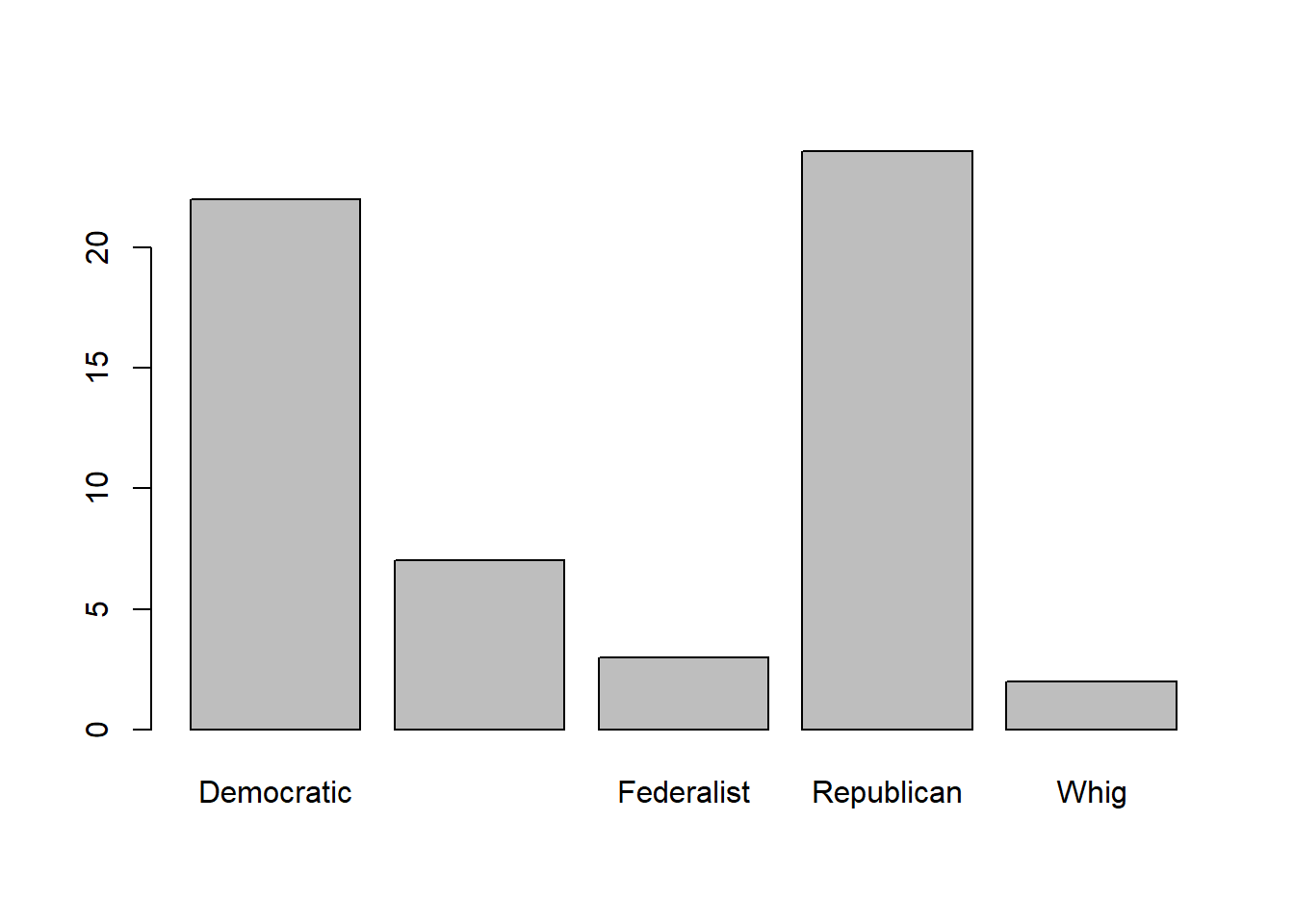 Last but not least we need a bar chart. Let’s jump back to the data on the Electoral College and make a bar chart to show how many times each party has won the electoral college.