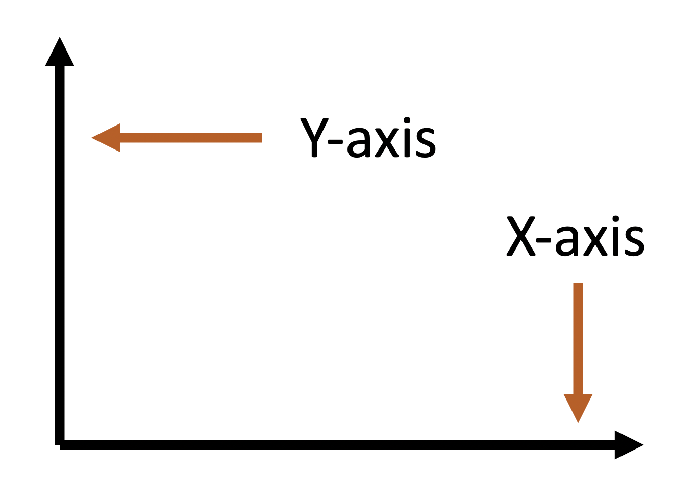 Before we go forward, let’s quickly review the anatomy of a graph. The y-axis always runs up and down (vertical) on the graph, and the x-axis runs side to side. The reason that’s important to memorize is so that if someone says something like “you should graph time on the x-axis” you sort of immediately picture what that means.