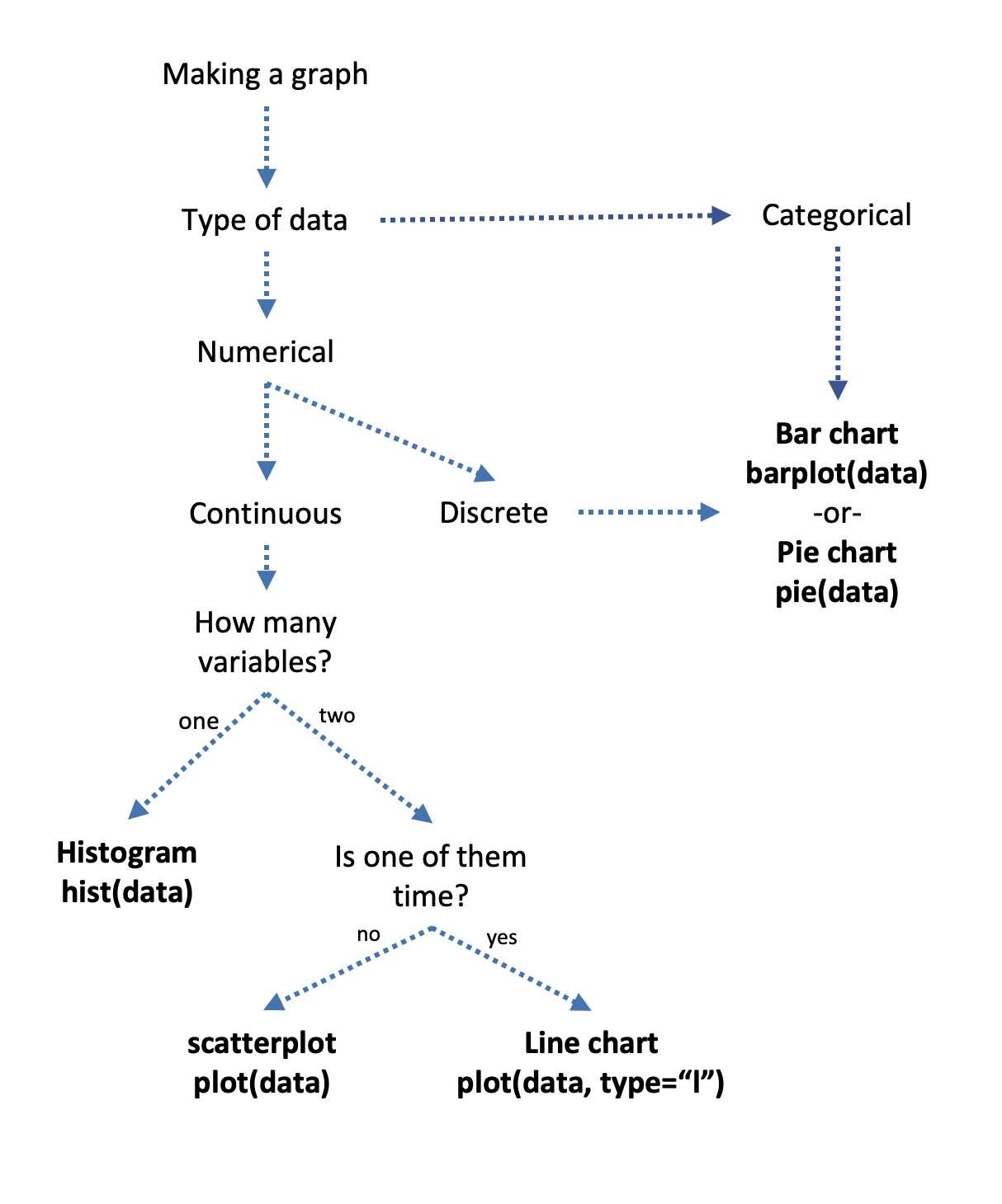You can be really creative in developing graphs. It’s sort of like the rules of fashion or cooking, where there are different rules for beginners than there are experts. I wouldn’t dare to put cucumber on my pizza, but I’m sure there’s some chef in New York doing that who knows enough to do it well. Here we’re going to go over the basics of creating good graphs. Choosing the right graph becomes something you’ll understand through practice, but in the meantime this flow chart should walk you through the decision. We’ll go down each path to describe the 5 chart types listed.