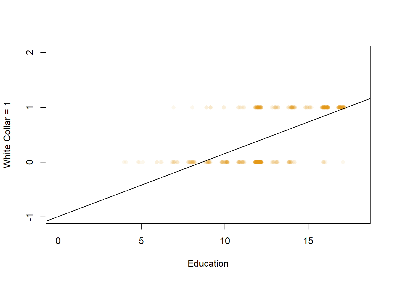 The linear regression results seem to indicate that yes, individuals with more education tend to be white collar workers. But an OLS regression isn’t really an appropriate way to answer that question, and it’s pretty easy to see why if we look at a graph of the two variables.
