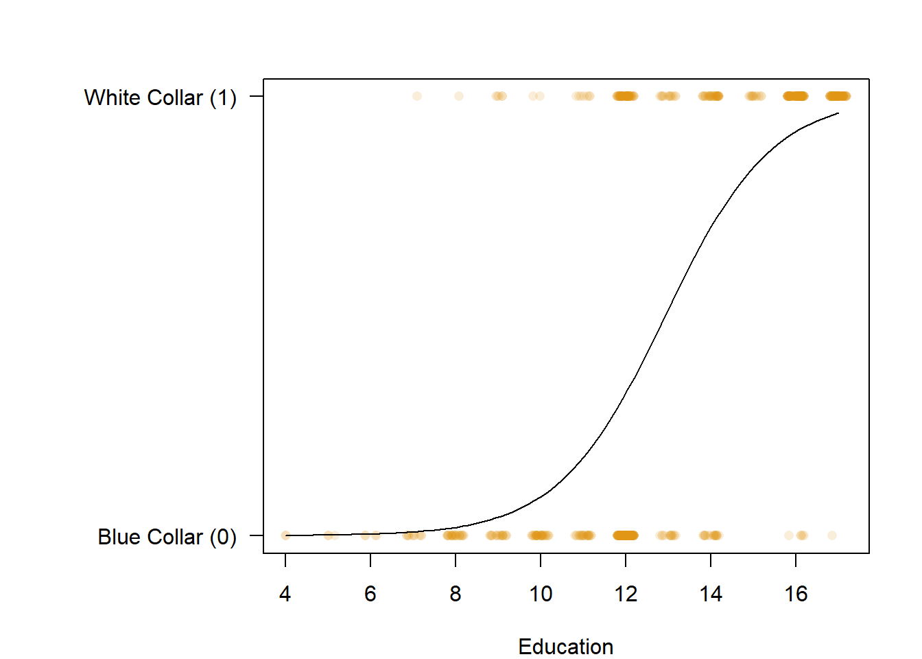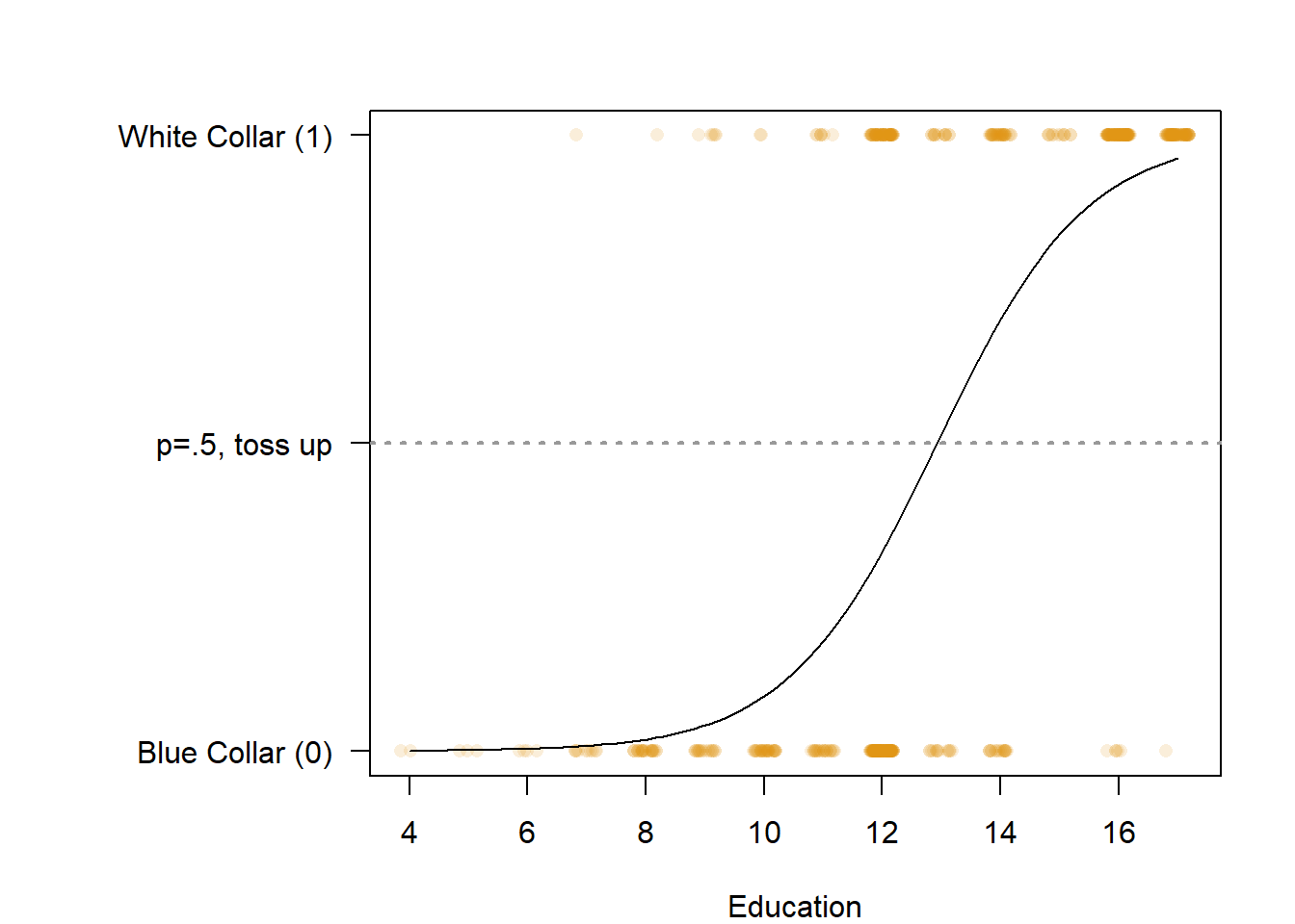 ## glm(formula = occupation ~ education, family = binomial, data = PSID1982)
