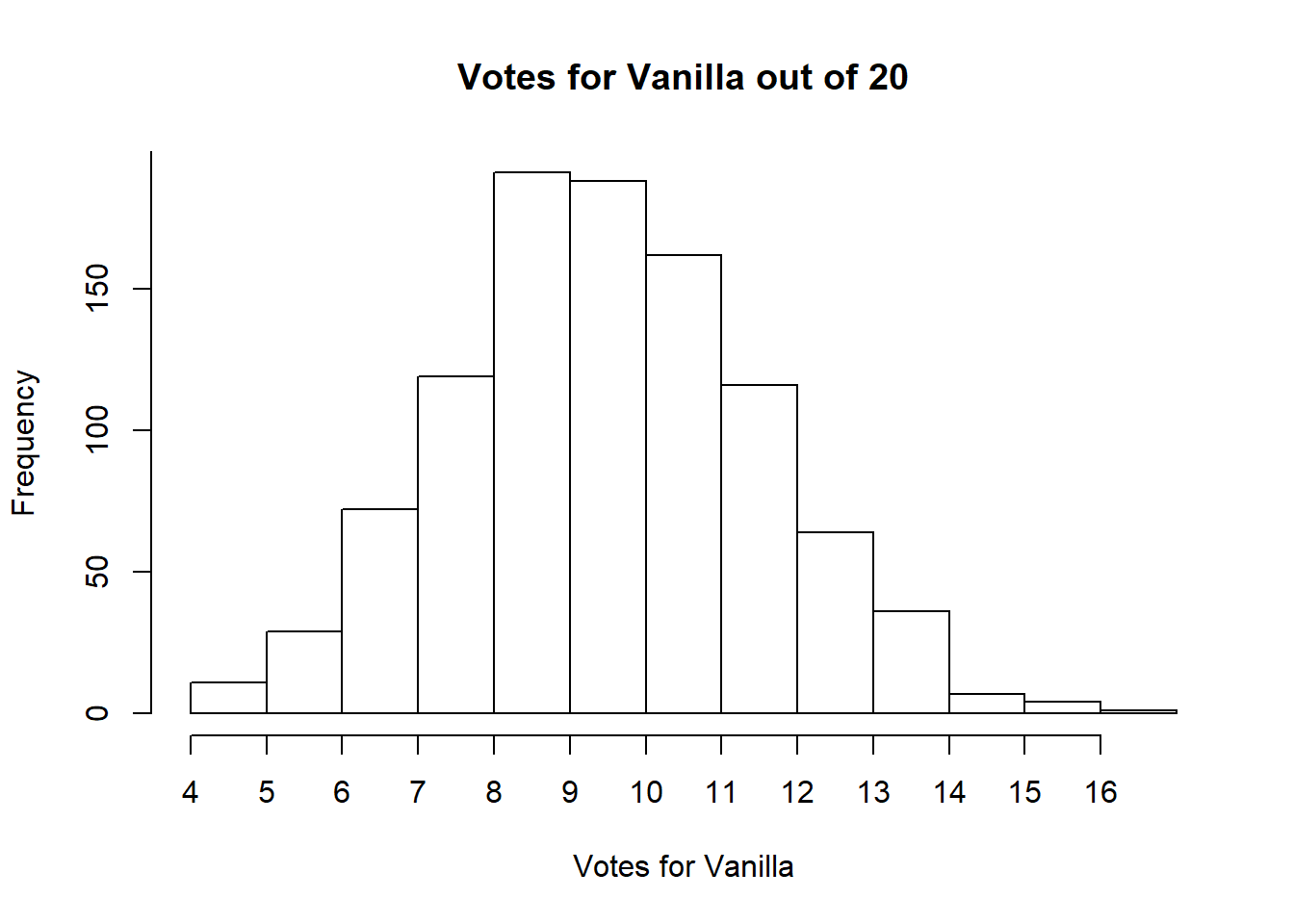 What if we did that exercise 1000 times, taking different random samples of 20 people? Let’s look at the total number of votes for vanilla below. And just to be clear, anyone that doesn’t vote for vanilla is then voting for chocolate, so we can see both how many people voted for vanilla and chocolate by just plotting one of the two flavors.