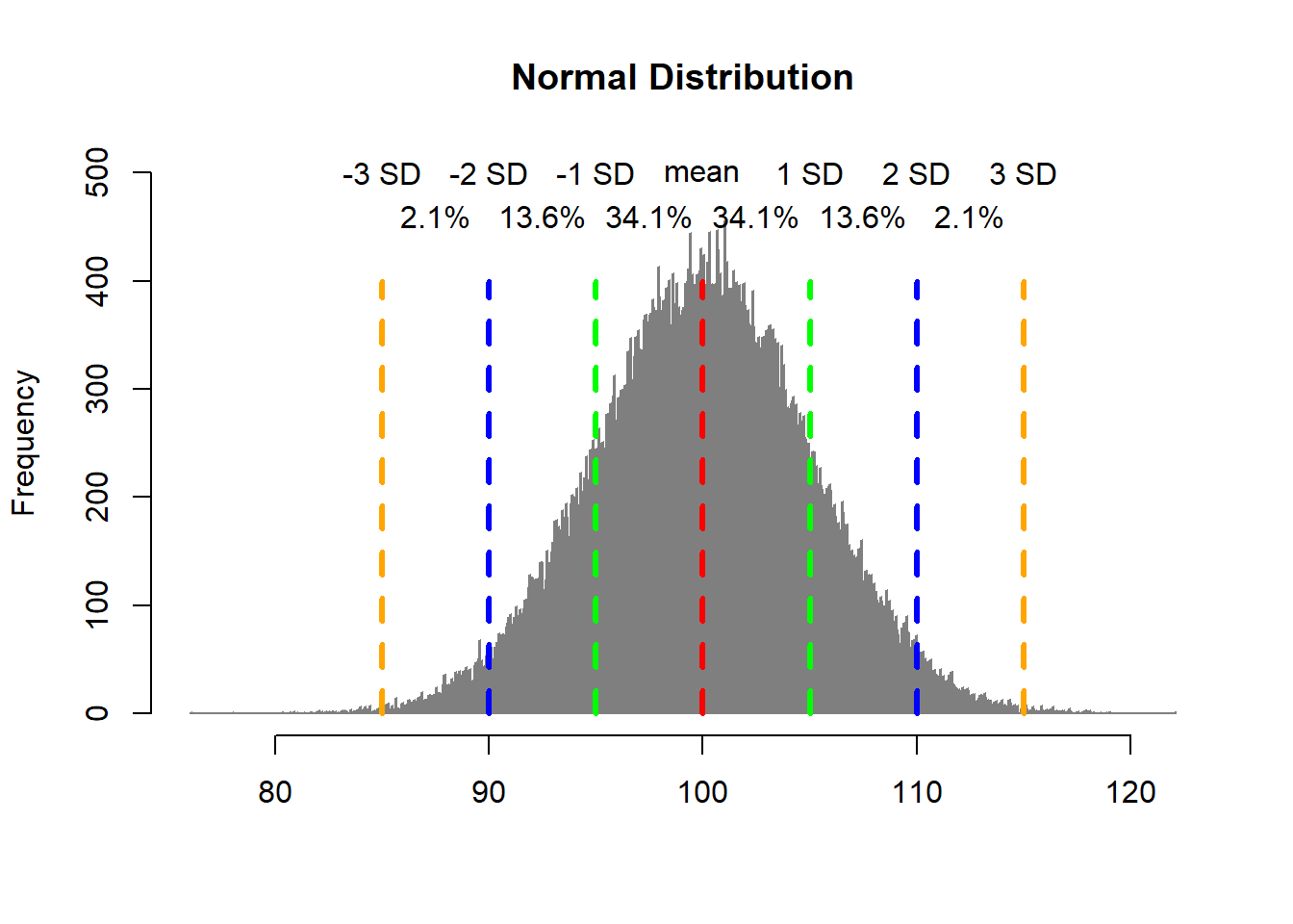 We met a normal distribution back in Chapter 10. What’s important about a normal distribution? Well the data forms around the mean evenly, with an equal proportion above and below the mean. But the coolest feature (and I do mean cool) is that the data follows the 68-95-99.7 rule, whereby 68% of the data falls within 1 standard deviation of the mean, 95% falls within 2 standard deviations of the mean, and 99.7 of the data falls within 3 standard deviations of the mean.