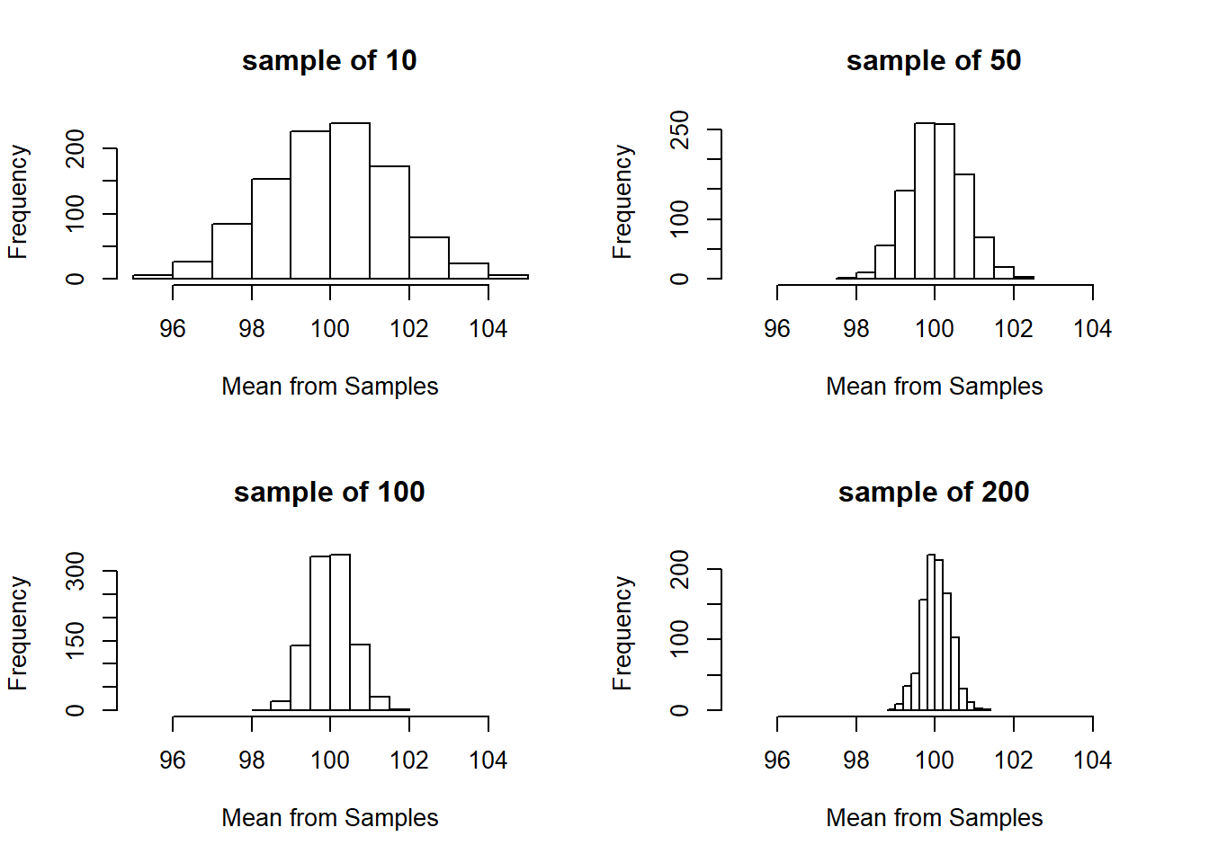 Let me demonstrate that below. Let’s imagine we have some data with a mean of 100 and a standard deviation of 5. Those are the characteristics of the population. Let’s take different size samples from that population and see how dispersed the data is.