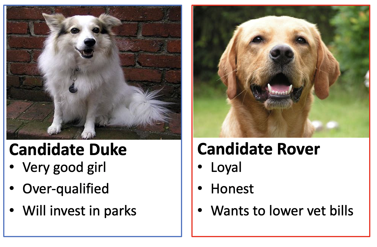 We can first calculate the sample mean. Votes for Duke or Rover are both categorical, but if we give one candidate a value of 1 and the other the value of 0, we can make the data numeric and discrete. If we make all votes for Duke 1, the sample mean becomes .523 or 52.3%, representing how much of the sample voted for that candidate. We could reverse that and give goves for Rover a value of 1, and the sample mean would be .477 or 47.7%, but let’s use Duke for this example.