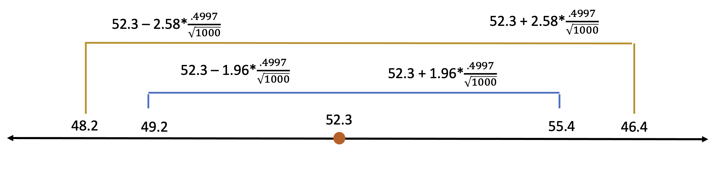 1.96? 2.58? Those numbers aren’t very intuitive and they just sort of have to be memorized through use. They refer to the specific number of standard errors a specific share of values fall within a normal distribution. I know I said above that 95% of values fall within 2 standard errors above, and that’s short of a short hand, but the actual value is 1.96.