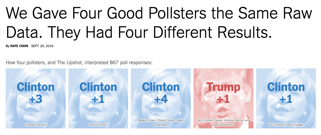 The New York Times in September 2016 ran a great article on exactly this topic. They took the sample poll data that they collected and gave it to 5 different pollsters to weight for them to match to their projections of likely voters in that year. Again, the same exact underlying data was used. What happened?