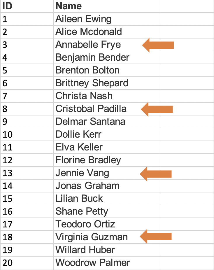 Let’s say you do have a sampling frame though. For instance, you might be hired to do a survey of members of the Republican Party in the state of Utah to understand their political priorities this year, and the organization could give you a list of their members because they’ve hired you to do the reserach. One method of constructing a simple random sample would be to assign each name on the list a number, and then produce a list of random numbers. Once you’ve matched the random numbers to the list, you’ve got your sample. See the example using the list of 20 names below