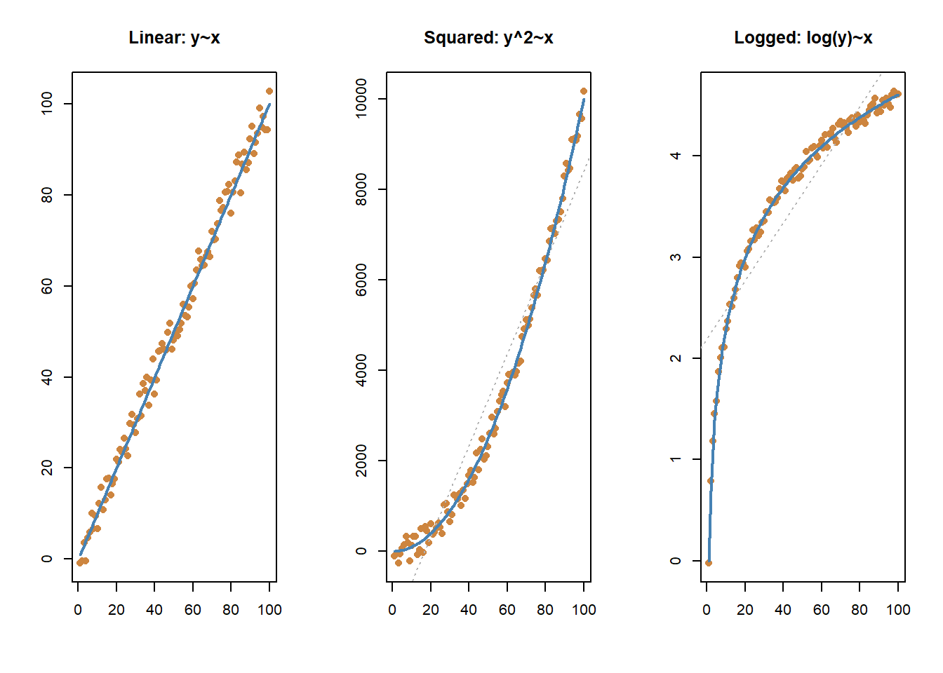 You can see the three different relationships correctly modeled with the blue line above. In addition, on the two non-linear graphs, you can also see what would happen if we tried to approximate a linear relationship in those instances. The line isn’t entirely useless - it correctly judges that as values increase on the x-axis they also increase on the y-axis. But it does a far worse job of predicting the actual values at specific points. We can do better than a linear relationship in those cases.