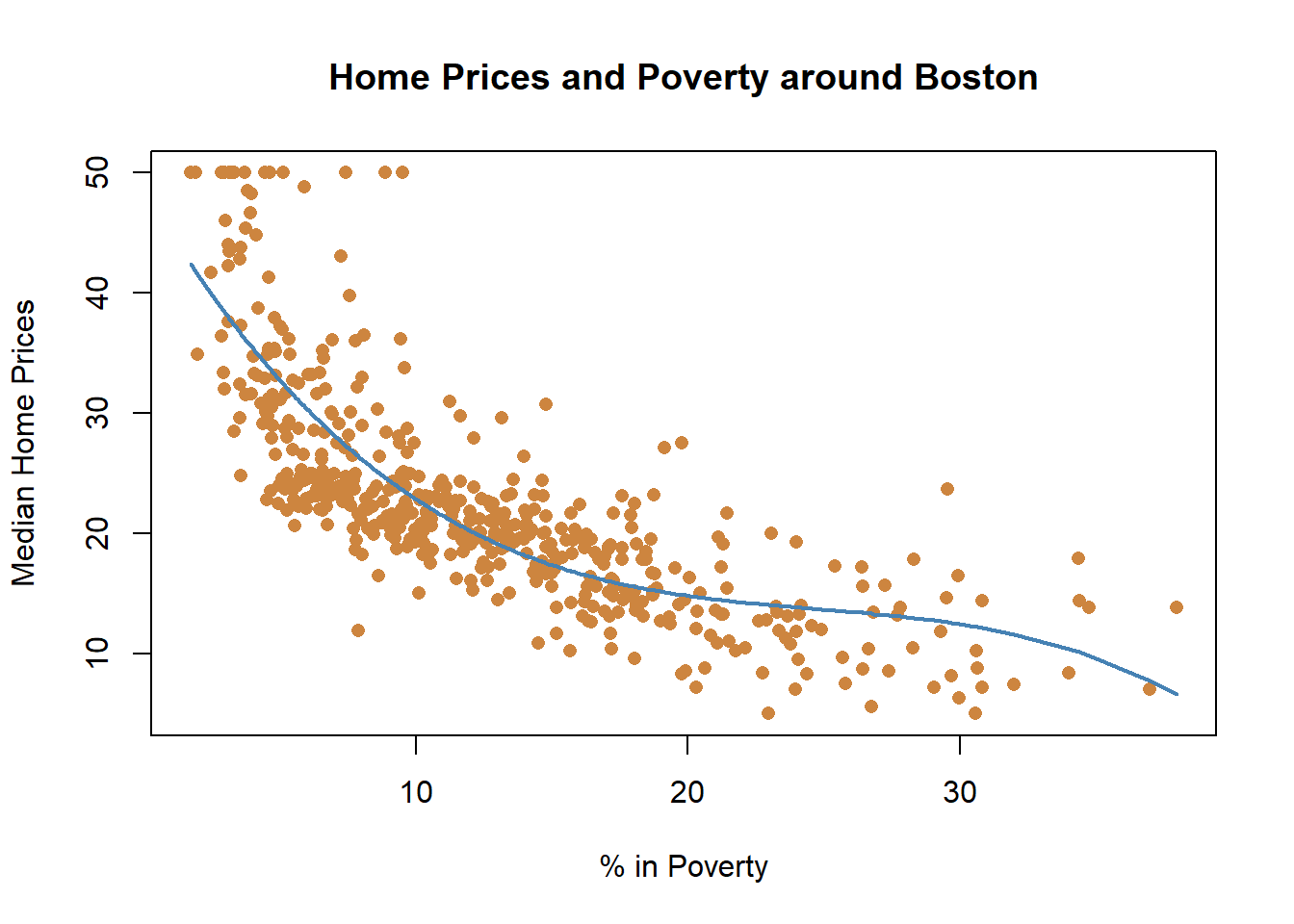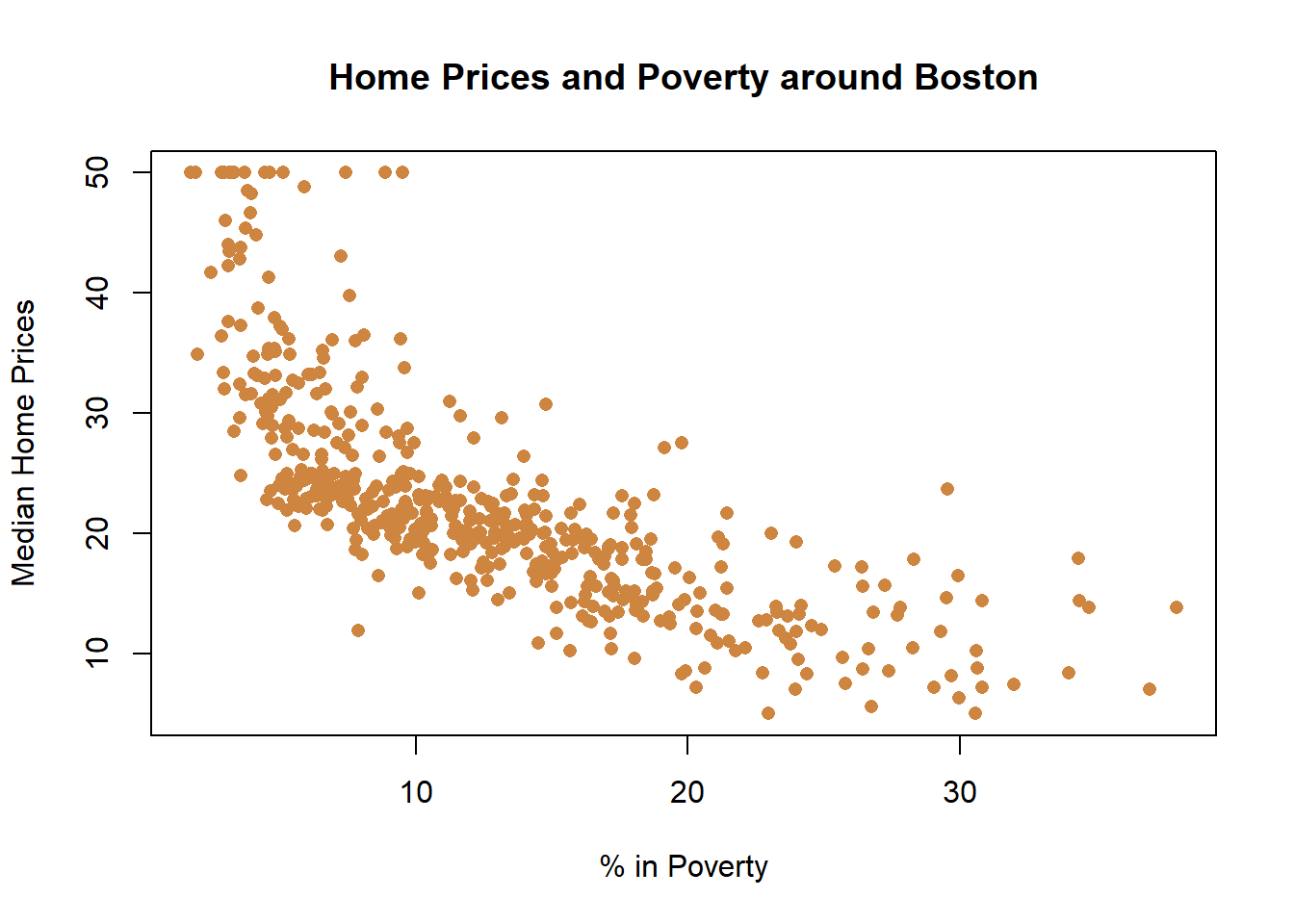 Let’s look at some data on median housing prices in neighborhoods in the suburbs of Boston. Specifically, we’ll start by analyzing the relationship between neighborhood poverty and housing prices. Do you think places with more poverty have higher or lower median home prices?