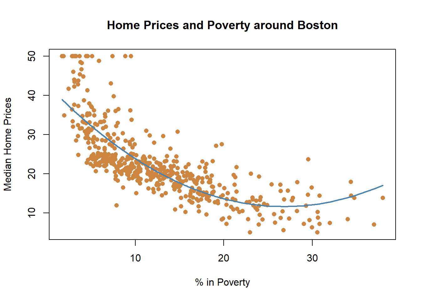 Unsurprisingly, it appears the relationship is negative: Where there is more poverty, there are lower home prices. But is that relationship linear? Is every increase in poverty associated with an equal decrease in home prices?