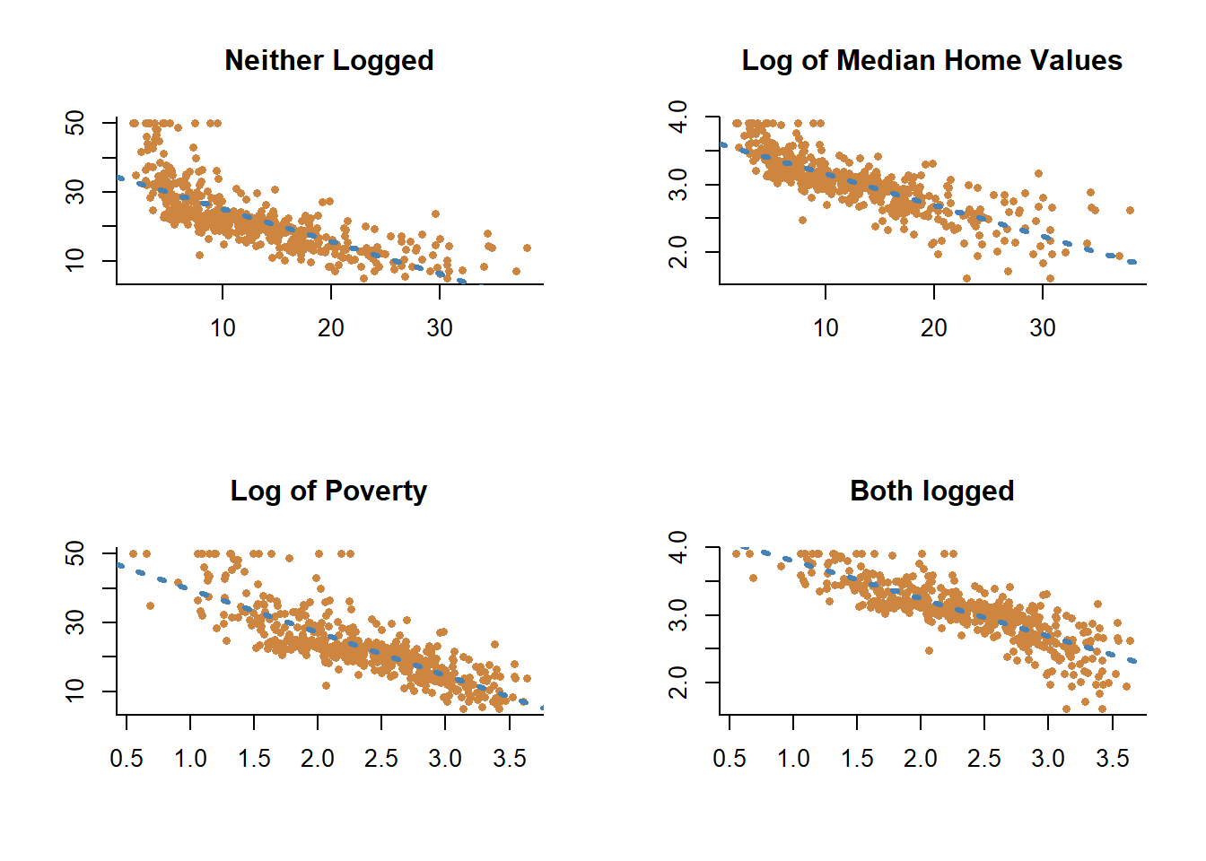 Let’s see how taking the log of poverty percentage and median home values adjusts the relationship below.