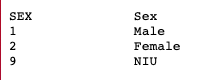 Okay, so we have 1’s and 2’s. One issue is that we don’t know what those mean. We have more 2’s than 1’s, but we don’t know whether Male’s were coded as 1’s or 2’s so these values have no meaning to us at the moment. We need to look at the code book for the data to understand what those values represent about respondents. It’s really useful to look through the code book before you start using your data, because most of the questions we’re asking in this section could be answered by just reading it… but reading instructions is boring, so I usually skip it as long as I can. What does the code book tell us about the variable SEX?