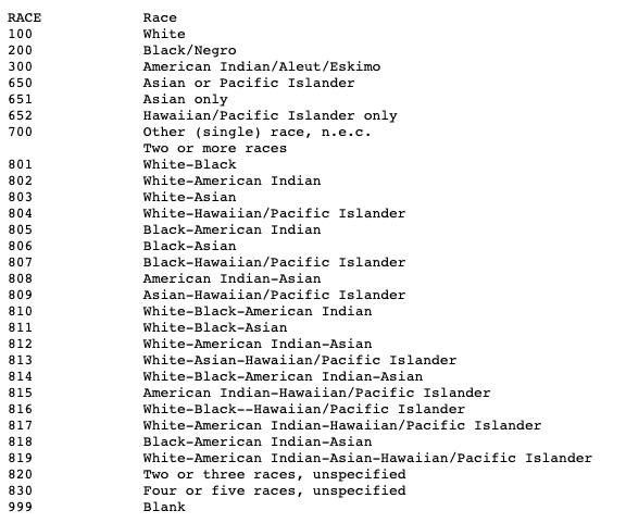 What that leaves is a lot of categorizations for either Other or combinations of different races. Again, it’s possible that your research will dictate that these should be left separate, but often we’ll want to combine those into a single category. Here we can do that by just asking whether the variable RACE is greater than 800.