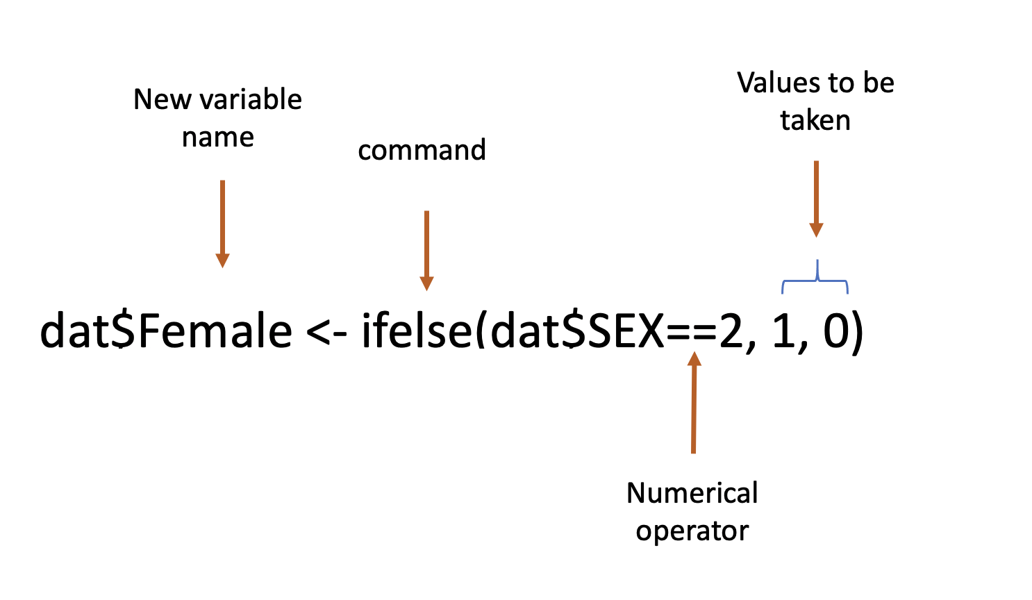 An ifelse statement reads a bit like a sentence. We’re asking R to determine which of two things is true, either the variable SEX equals 2 or it doesn’t. If it does equal 2 (dat$SEX==2), then we want the new variable we’re creating named Female to take the value 1 (the first of two options we’re giving). If the column SEX doesn’t equal 2, then the new variable should take the value 0. As a result, our new variable Female is a series of 0’s and 1’s.