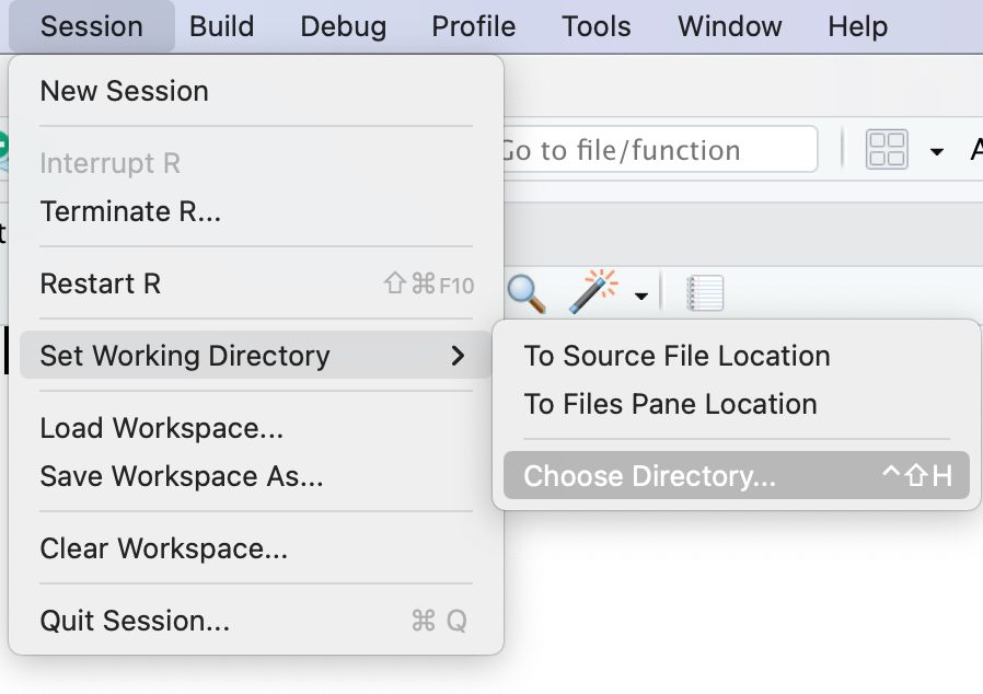 You can also set the working directory by pointing and clicking. At the top of the screen you can click on session, then Set Working Directory, then choose directory. There you can click through the folders on your computer and select exactly where you want R to operate, which should be wherever you’ve saved folders to.