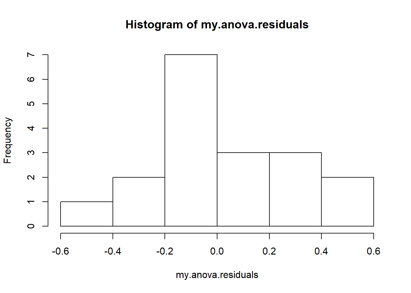 hist( x = my.anova.residuals ) # plot a histogram (similar to Figure @ref{fig:normalityanova}a)