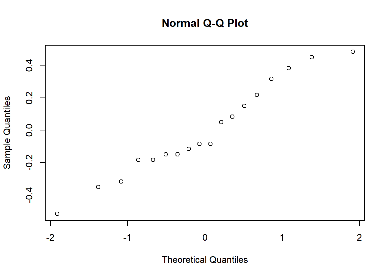 Testing the normality assumption is relatively straightforward. We covered most of what you need to know in Section 13.9. The only thing we really need to know how to do is pull out the residuals (i.e., the \(\epsilon_{ik}\) values) so that we can draw our QQ plot and run our Shapiro-Wilk test. First, let’s extract the residuals. R provides a function called residuals() that will do this for us. If we pass our my.anova to this function, it will return the residuals. So let’s do that: