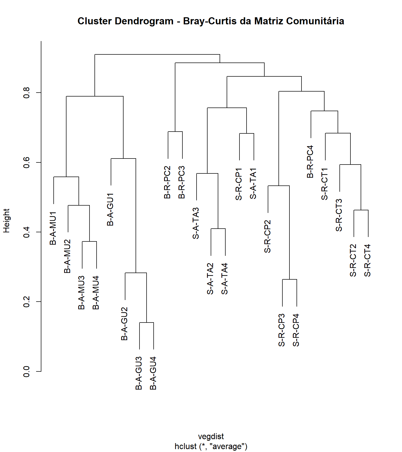 Para conhecermos os dados, vamos criar uma classificação baseada na distância Bray-Curtis e UPGMA como método de fusão, a partir das matrizes de dados de interesse ppbio** com suas devidas relativizações e transformações.