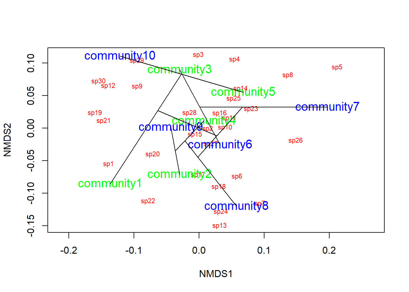 Essa é uma maneira intuitiva de entender como as comunidades e espécies se agrupam com base nos tratamentos possveis. Nesse caso, comunidades 1-5 em verde e comunidades 6-10 em azul. Também é possível plotar elipses e “gráficos de aranha” usando as funções ordiellipse e orderspider, que enfatizam o centróide das comunidades em cada tratamento.