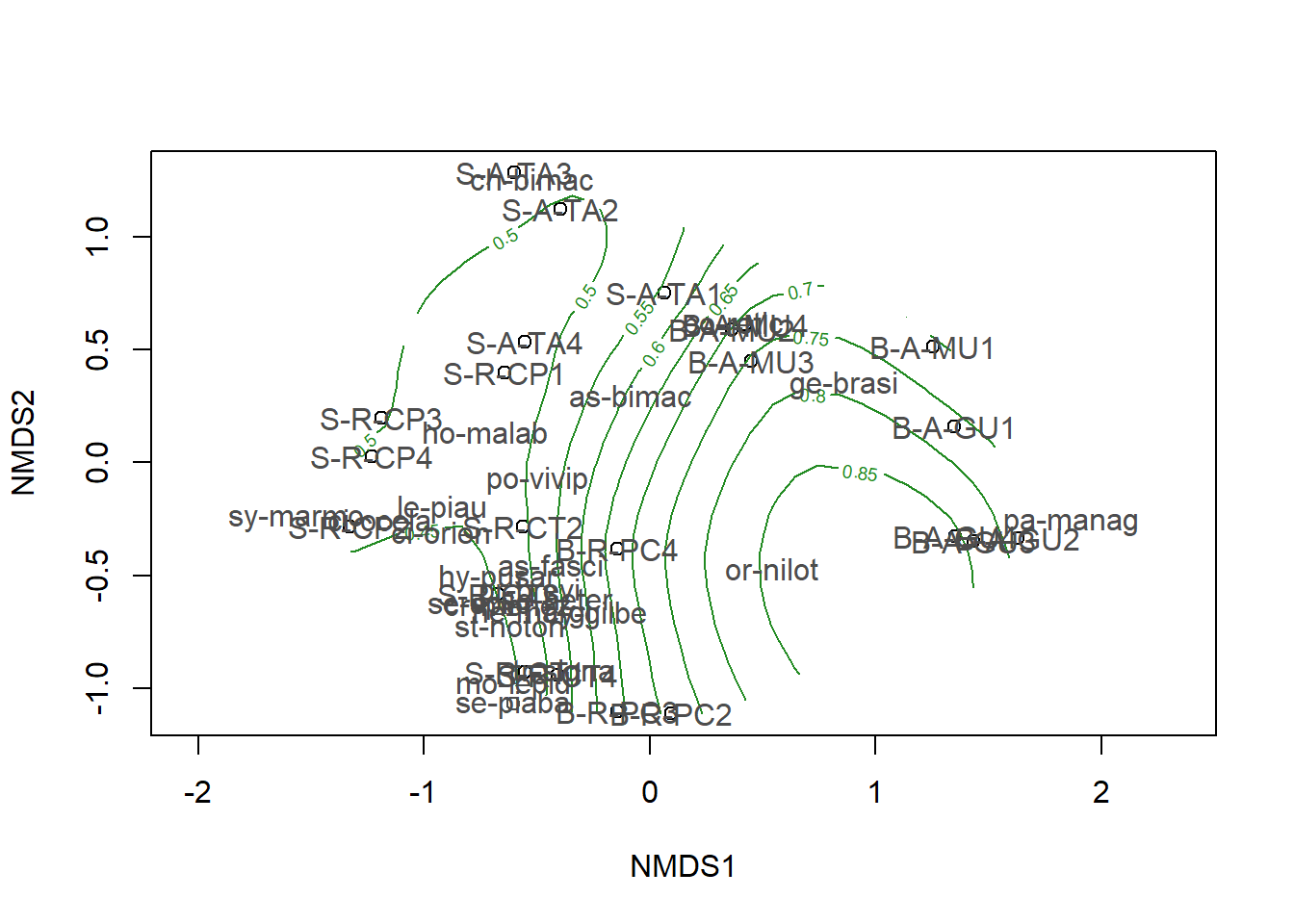 knots <- nrow(m_trns)Agora usa-se a função ordisurf para plotar as linhas de contorno. A quantidade de linhas de contorno é definida pelo comando knots =. Se knots = 0 ou knots = 1 a função ordisurf ajustará uma tendencia linear a superfície, e se knots = 2 a função ajustará uma tendência quadrática, ao inves de linhas retas. E por fim, exibe-se as espécies no gráfico.