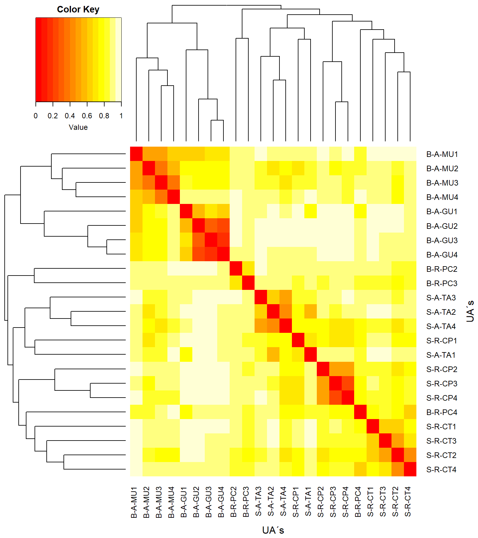 xlab = "UA´s", ylab = "UA´s",