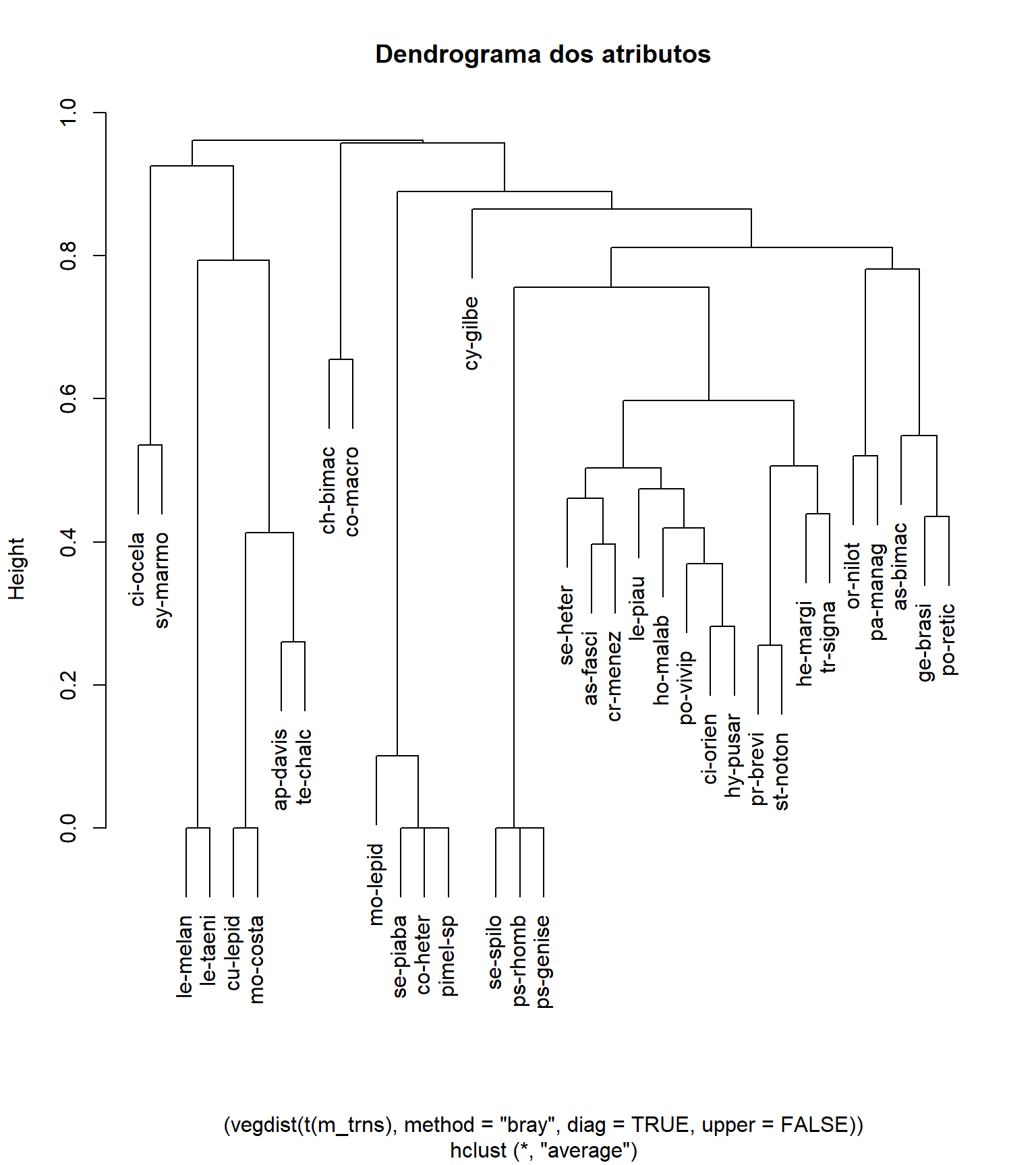 plot (cluster_spp, main = "Dendrograma dos atributos")
