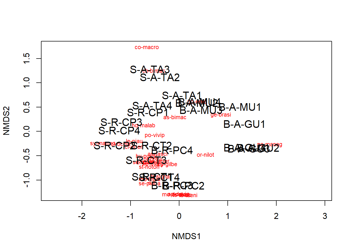 orditorp(nmds, display = "species", col = "red", air = 0.01)
