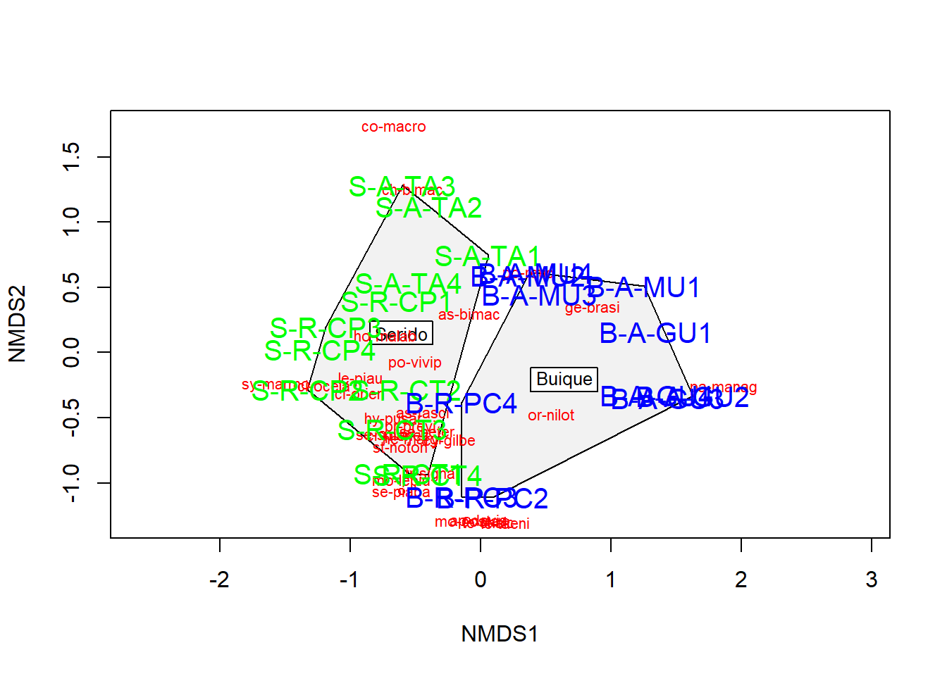 ordihull(nmds, groups = grupos, draw = "polygon", col = "grey90", label = TRUE)